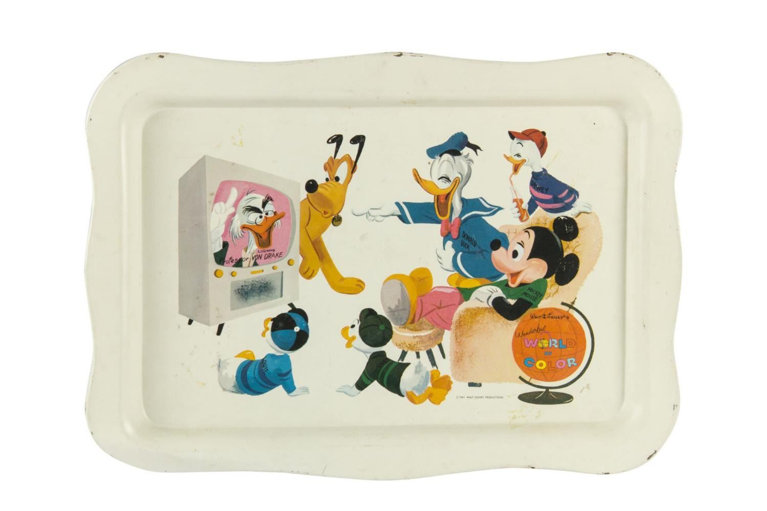 (Disney, 1961) A tin-litho TV tray promoting “Walt Disney’s Wonderful World of Color,” featuring Mickey, Pluto, Donald and his nephews, and Ludwig Von Drake. Measuring 12.5" x 17.5", the tray displays in good condition with stains, oxidation, scratches, wear, and a bent-back bottom left corner.