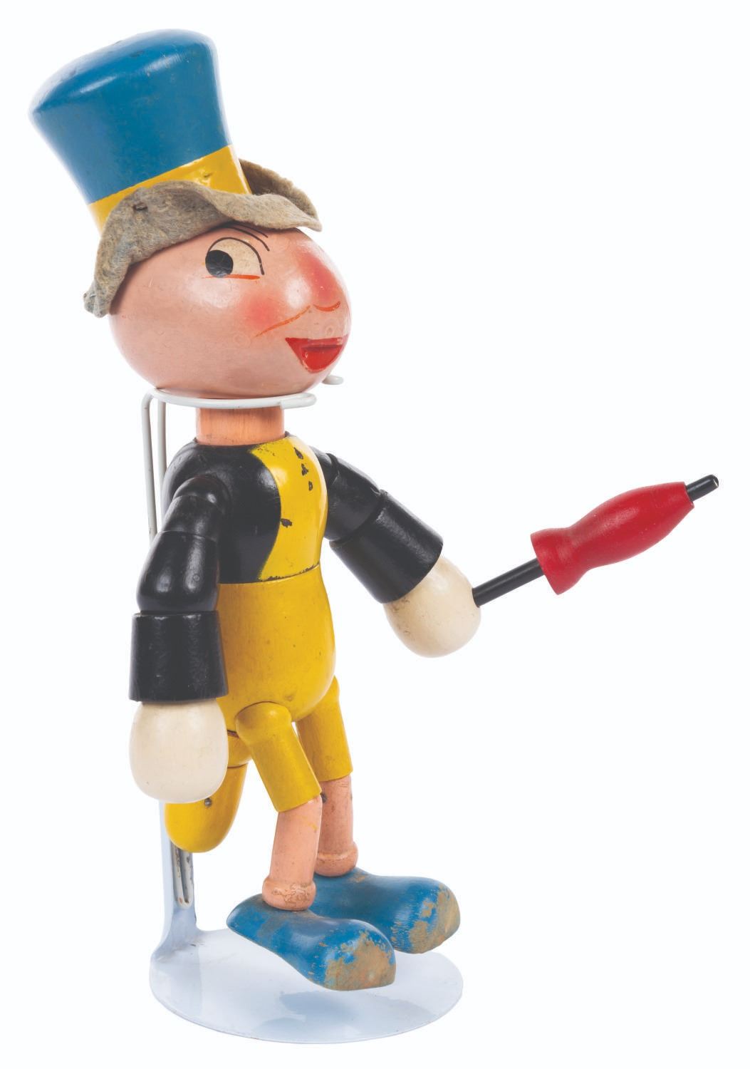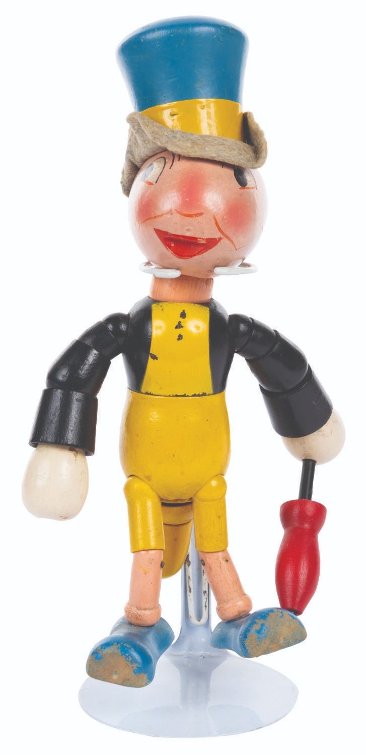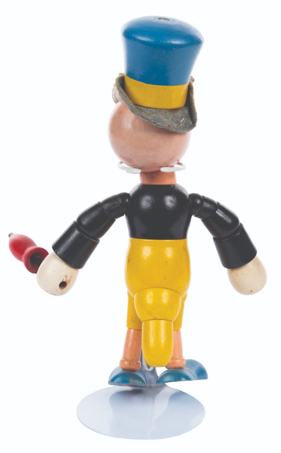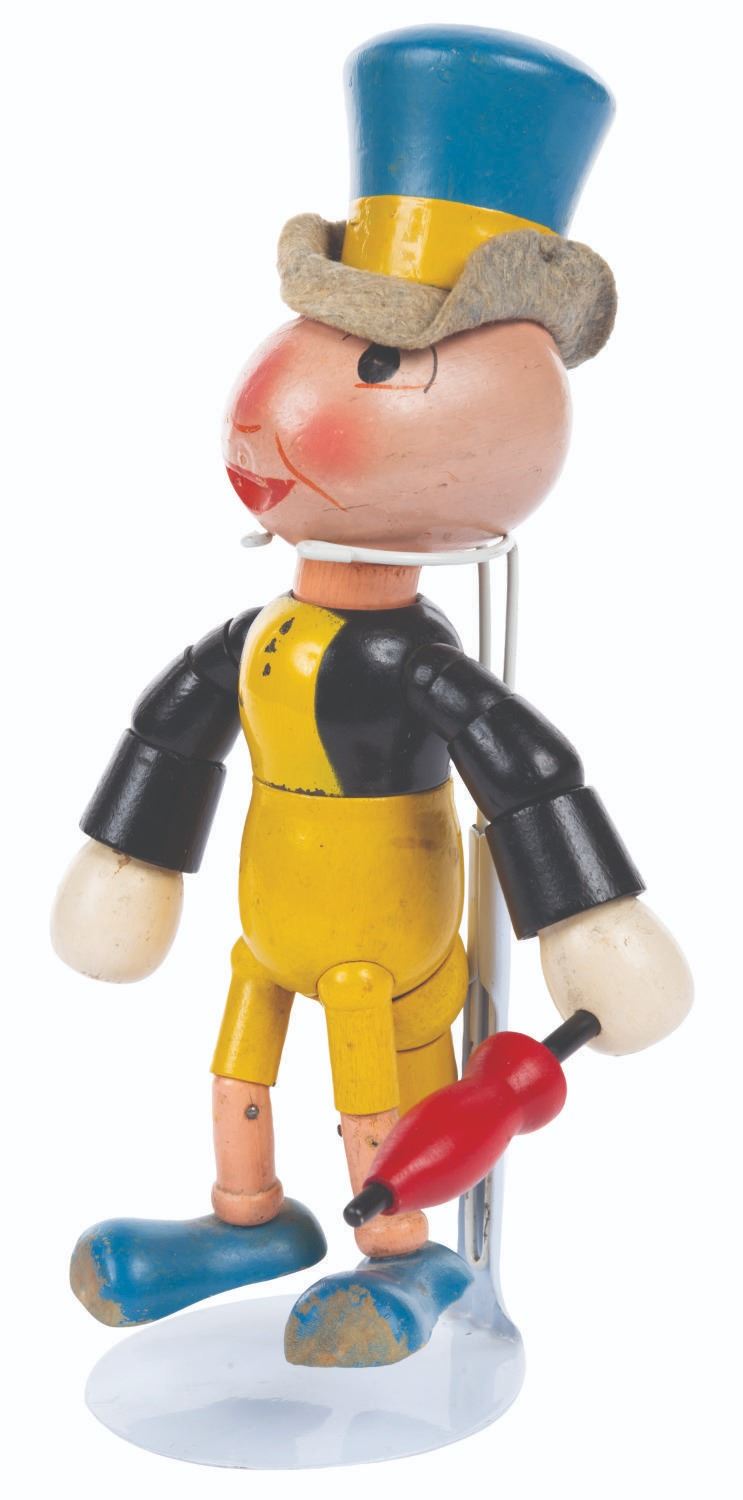 (Ideal, 1940) A jointed doll of Jiminy Cricket produced by the Ideal Toy and Novelty Company. Jiminy has delicate hand-painted features, wooden umbrella in hand, and cloth elements for his hat brim, collar and tie. Measuring 8.5" x 5", the wooden doll displays in good condition with scuffs and wear to felt and paint from handling.