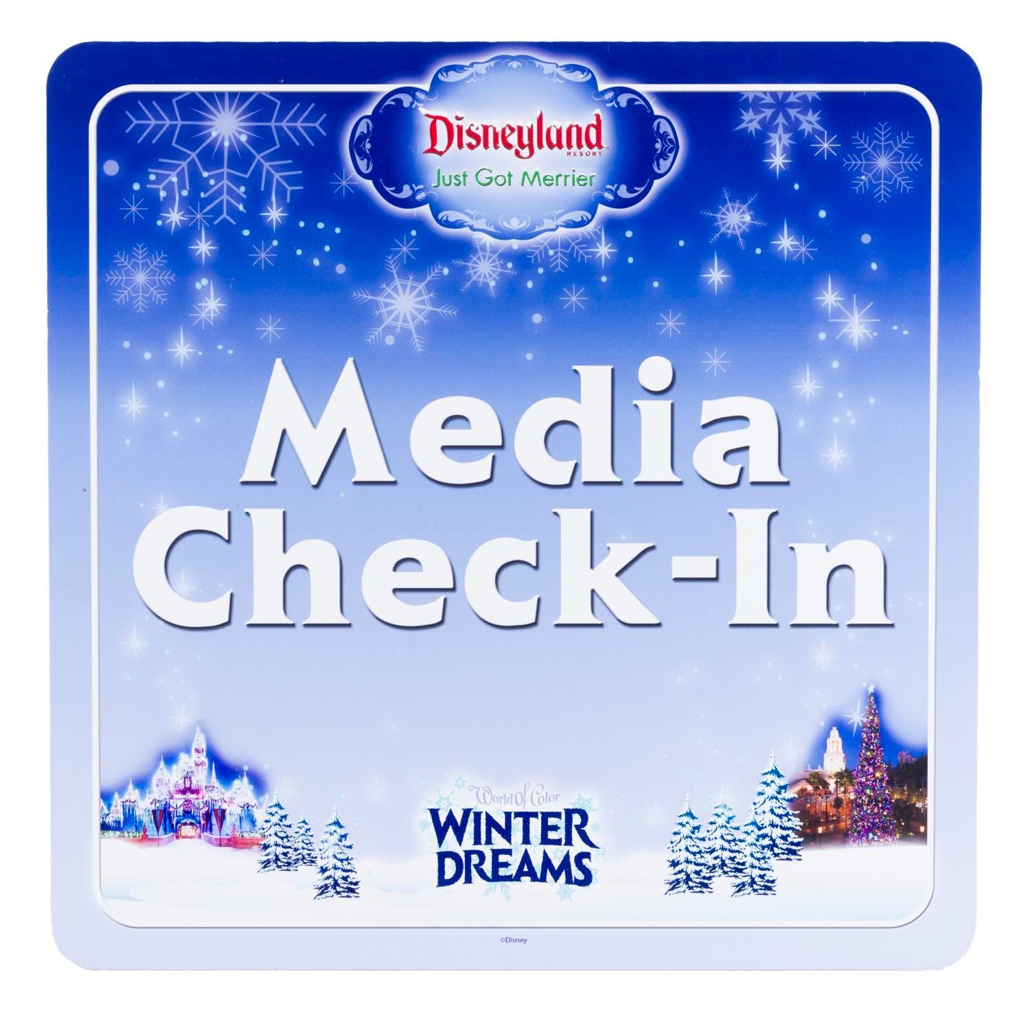 (Disney California Adventure, 2013-15) A Media Check-In sign for the "World of Color Winter Dreams" nighttime spectacular at Disney California Adventure Park. Measuring 20" x 20", this acrylic sign is in very good condition with faint dimples and minor wear.