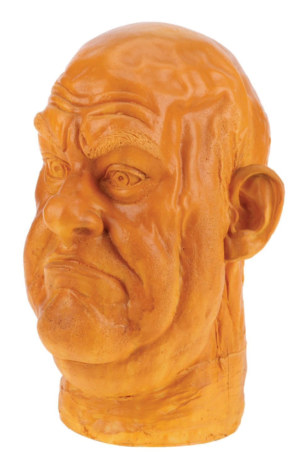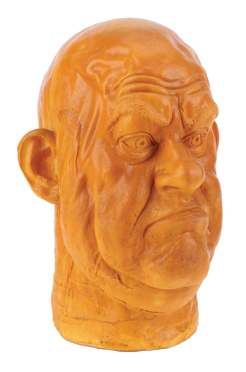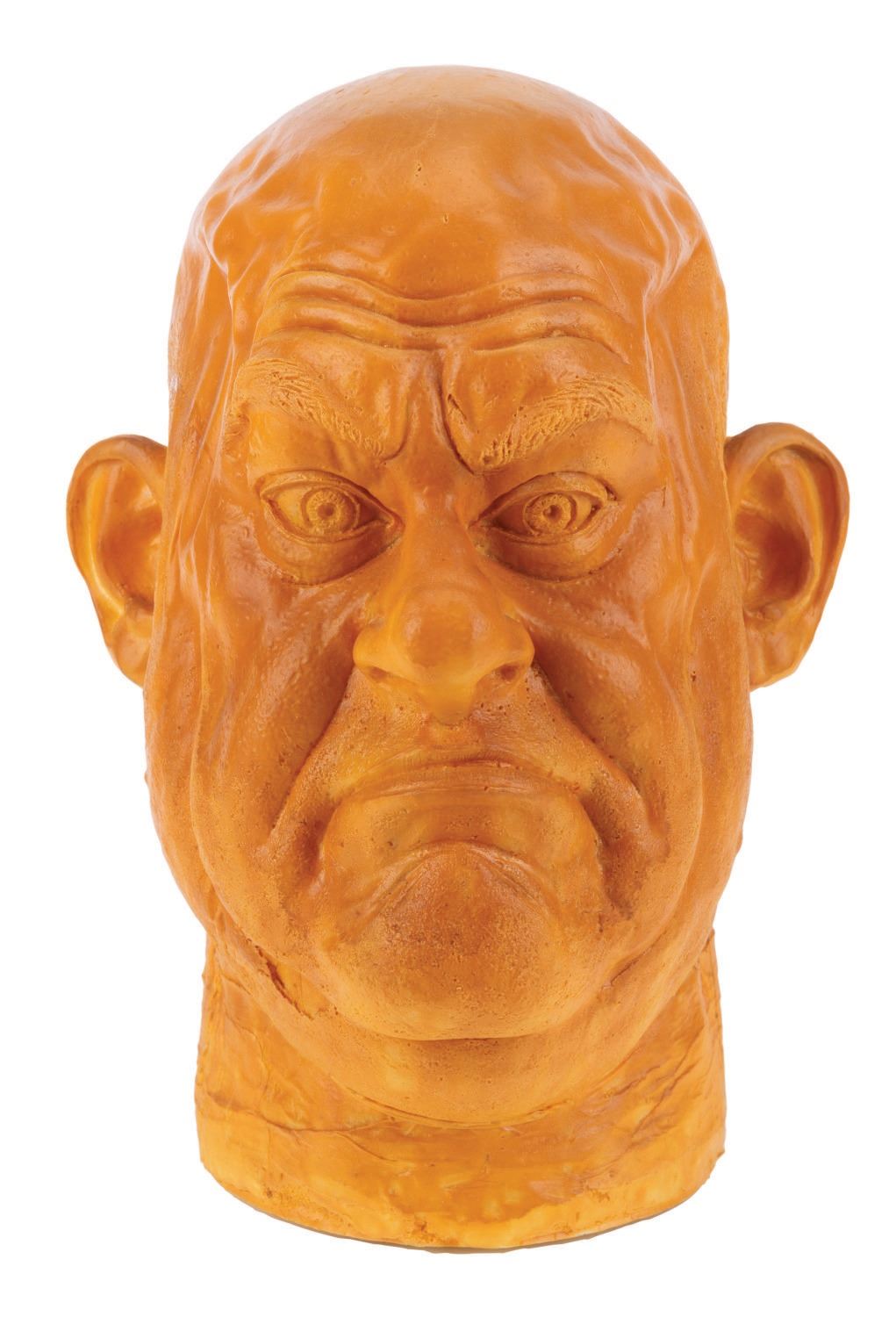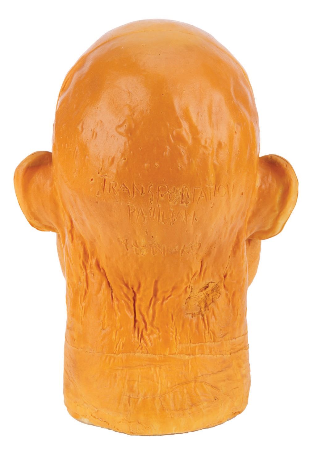(Epcot, 1980s-90s) A WED Imagineering prototype head used to create some of the "outer skin" molds for both Audio-Animatronics and "simple figure" head assemblies which populate the wheel-shaped World of Motion at Epcot Center. The head is constructed in foam and retains original masking, paint, WED identification "Transportation Pavilion" and "4RN-10" impressions on back of head, and other features of production application. The head was used for Audio-Animatronics figures in the attraction. Measuring 11.5" tall and 11.75" in diameter, it displays in good condition, retaining original production wear.