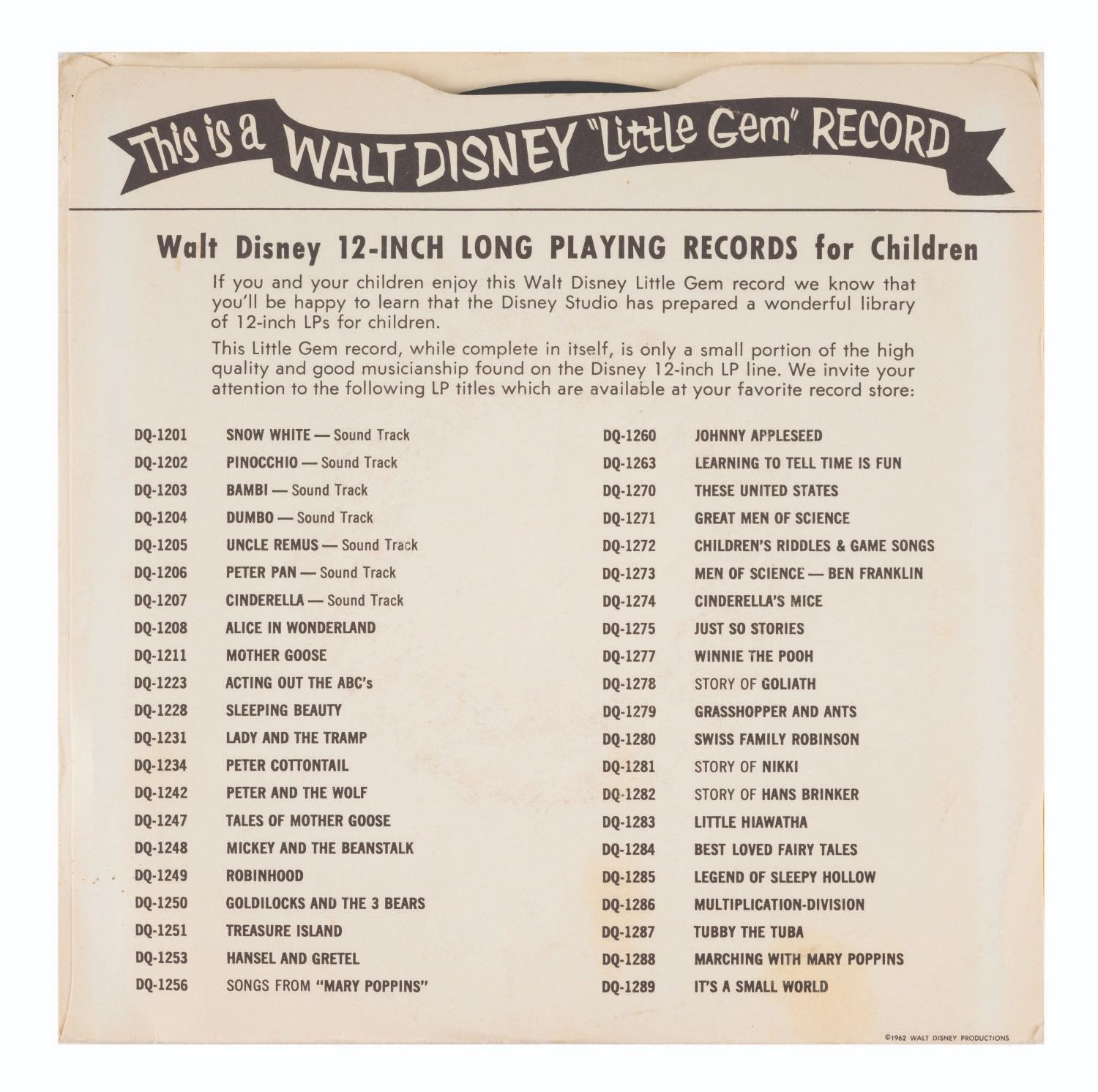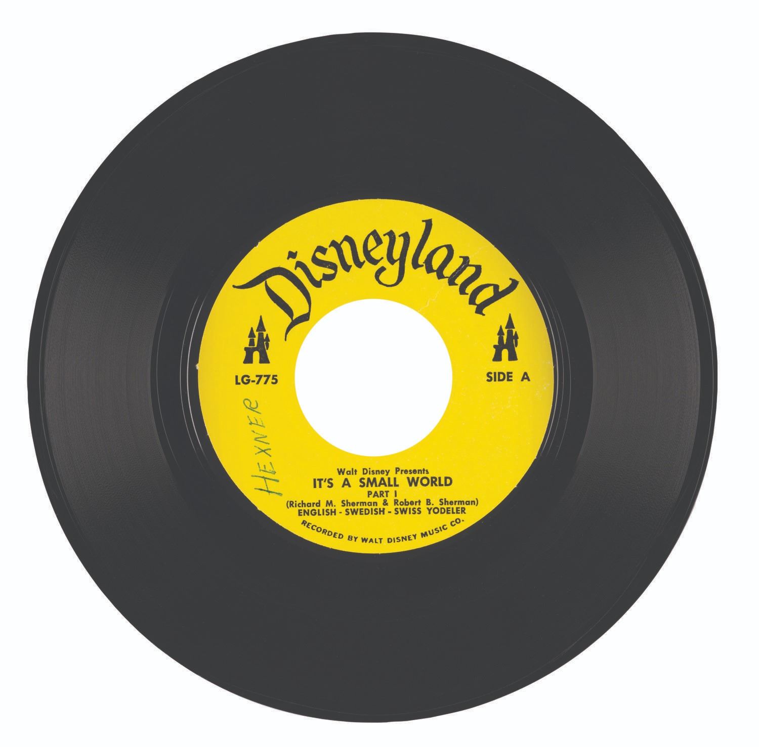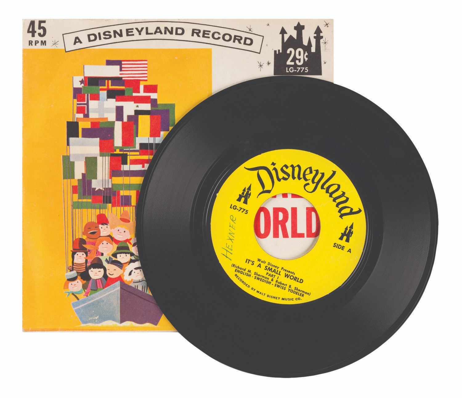 (Disney, 1964) An "It's a Small World" souvenir 45 RPM record with original sleeve from the 1964 World's Fair. The store mailer sleeve of the Walt Disney "Little Gem" Disneyland Record features artwork of the Children of the World aboard the "Happiest Cruise That Ever Set Sail." Measuring 7.25"x7.25", the record and sleeve are in good condition with annotation and minor wear to the record; and scuffs, minor creases, and yellowing to the edges of the sleeve.