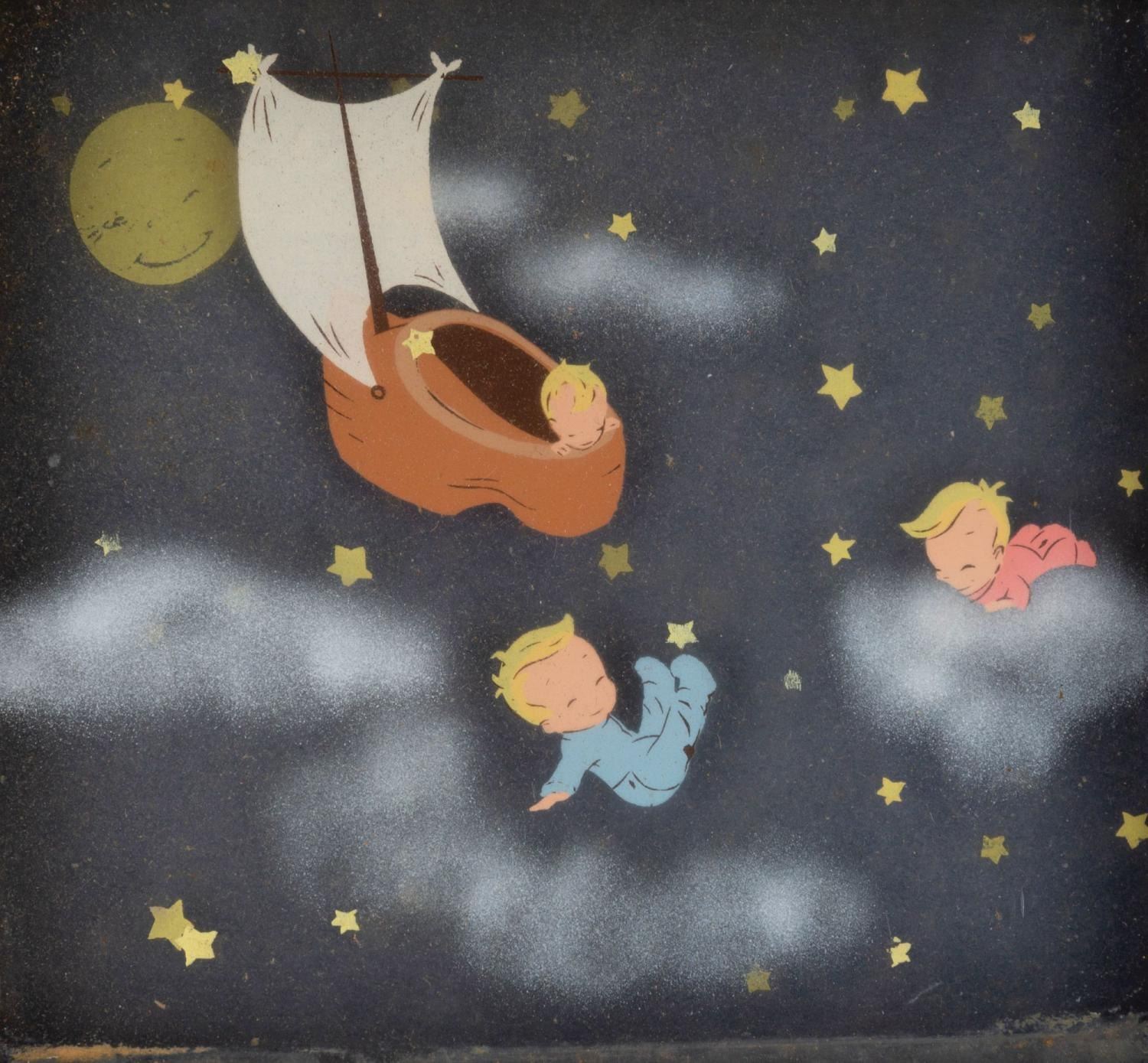 (Disney, 1938) A “Wynken, Blynken, and Nod Playing in the Clouds Multiplane Painting No. 10” by Courvoisier Galleries of San Francisco. After their success marketing original production cels, Courvoisier presented these hand-painted multiplane paintings to demonstrate Disney's Multiplane Camera including this Silly Symphony-inspired image. Composed of two hand-painted glass layers, the piece measures 8.5” x 9” and is in very good condition, with light wear and scuffs to the frame which retains the original Courvoisier back label.