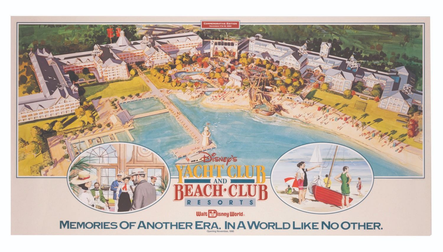 (Walt Disney World, 1990) A Commemorative Edition poster for the opening of Disney's Yacht Club and Beach Club Resorts at Walt Disney World, dated November 17 & 18, 1990. Measuring 33.5" x 17.5", the poster is in fine overall condition.
