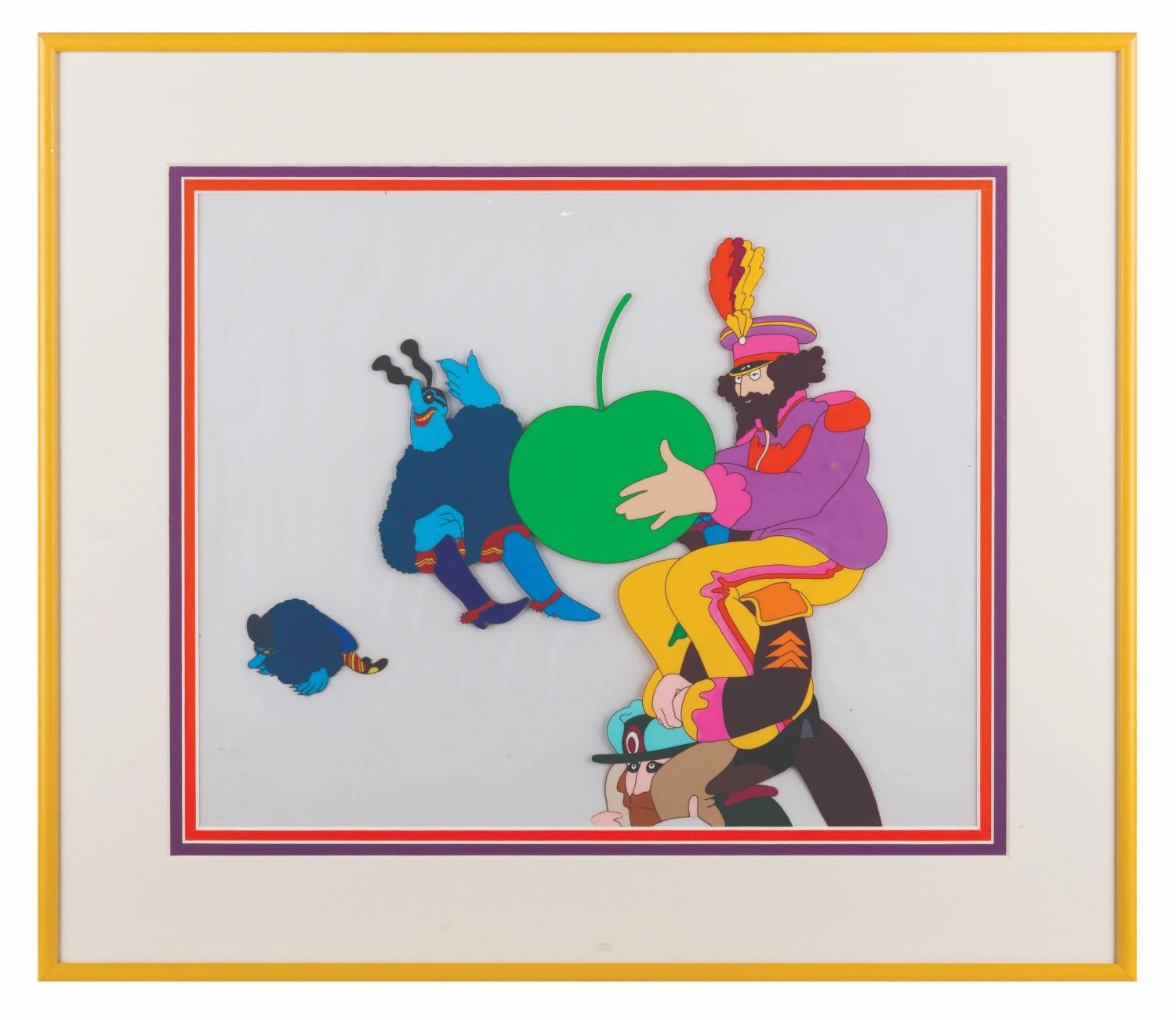 (United Artists, 1968) An original multi-layer production cel of Ringo Starr and John Lennon, a Chief Blue Meanie, and one of his minions from “Yellow Submarine." The hand-painted cel was sold in Hallmark stores between 1969 and 1970 and comes with its original logo sticker on the reverse of the frame. The characters have an image size of 10.5” x 11” on an 11.5” x 14” visible cel. The entire framed piece measures 17.25” x 19.75”. The cel is in very good condition with light warping from age and light scuffs to the frame.