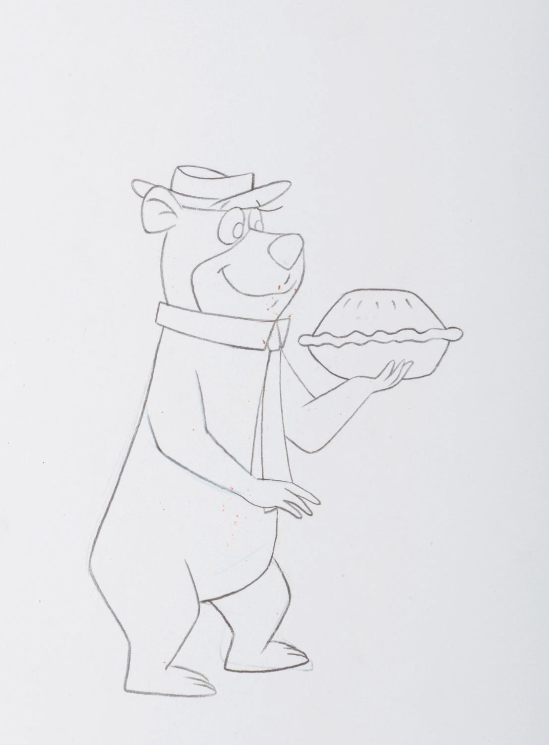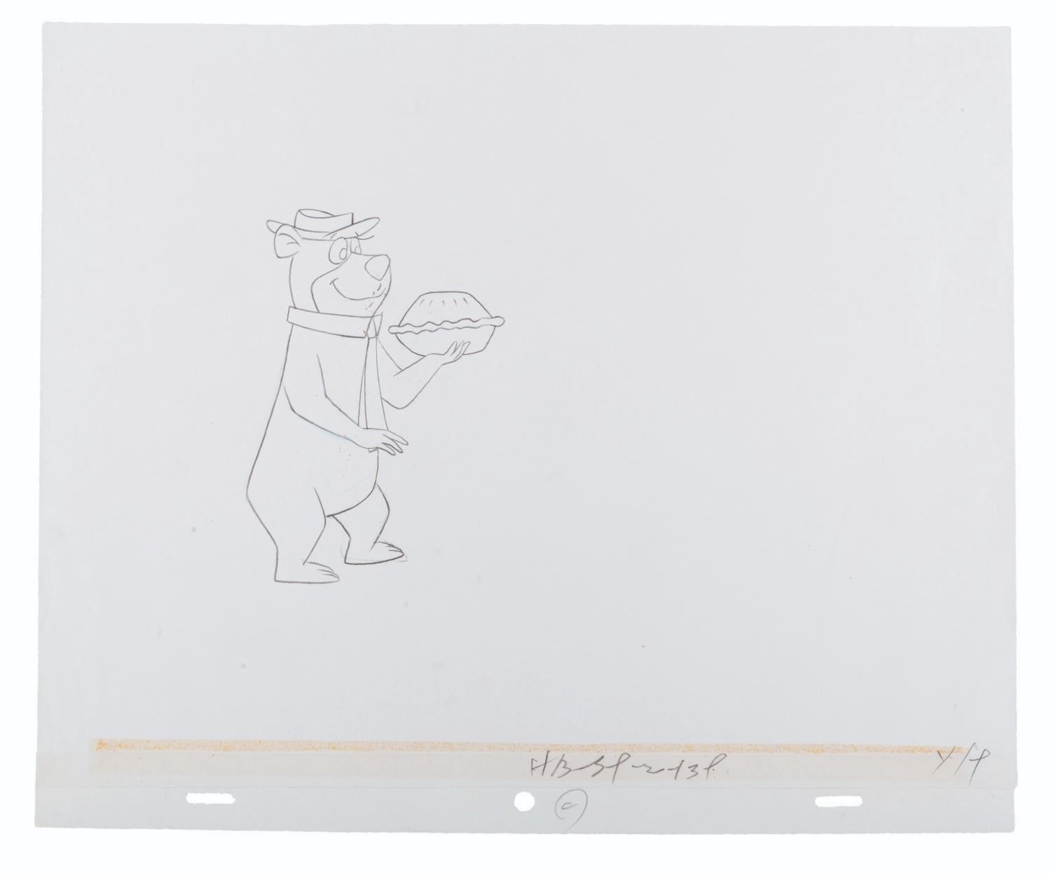 (Hanna-Barbera, 1980s) An original production drawing of Yogi Bear holding a pie. With a character image size of 3.25 " x 4.75 " on 10.5 " x 12.5 " animation paper, the graphite drawing displays in very good condition with light creases and reattached peg holes.