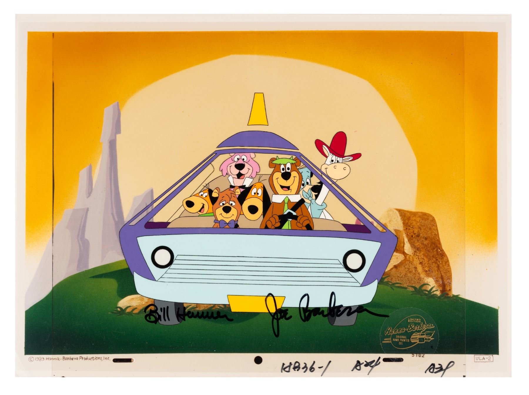 (Hanna-Barbera, 1987) An original production cel from “Yogi Bear and the Magical Flight of the Spruce Goose” signed by Bill Hanna and Joe Barbera, featuring Yogi Bear, Boo-Boo, Huckleberry Hound, Snagglepuss, Quick Draw McGraw, Augie Doggie, and Doggie Daddy. With a character image size of 7” x 8.5” the 10.5” x 12.5” cel is in very good condition with light wear from production use and is presented with a color copy reproduction background.