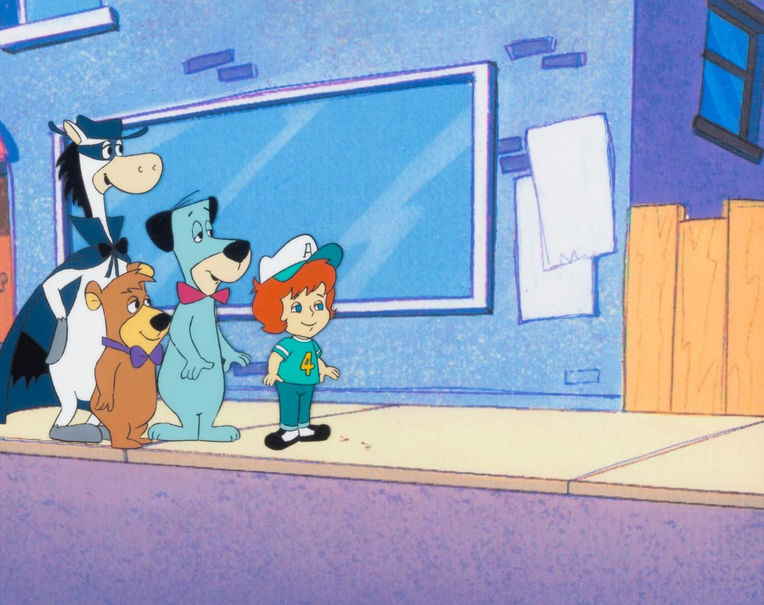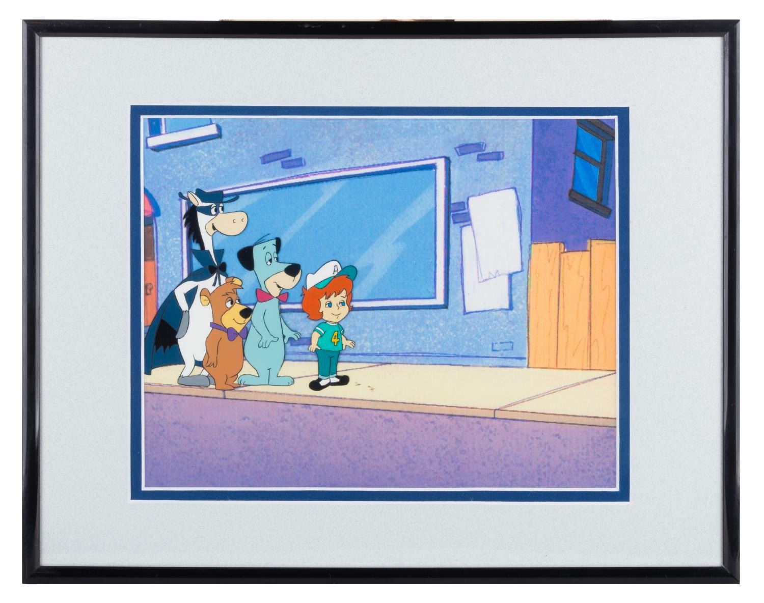 (Hanna-Barbera, 1987) An original hand-painted production cel of Boo-Boo, Bernice, Huckleberry Hound, and Quick Draw McGraw from the made-for-TV film "Yogi Bear and the Magical Flight of the Spruce Goose." The characters have an image size of 4" x 4.25" in a 7.5" x 9.5" window of an 11.5" x 14.5" framed matte. The cel is in very good condition with spots of paint loss and scratches, while the frame is in very good condition with light wear from display.