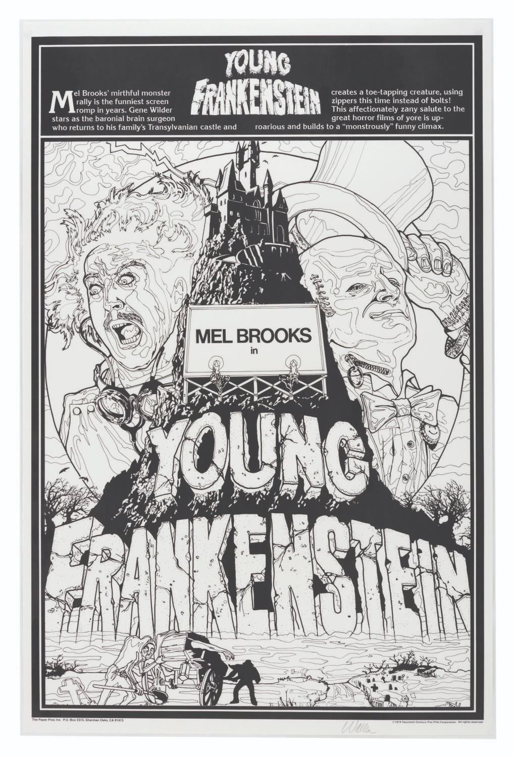 (The Paper Pros Inc., 1974) A large laminated coloring poster for Mel Brooks' comedy classic "Young Frankenstein." The Hollywood Movie Doodles poster is signed by designer Bill Wallen in pencil at the lower right. Measuring 23.25" x 35.25", the laminated poster is in very good condition with light scratches.