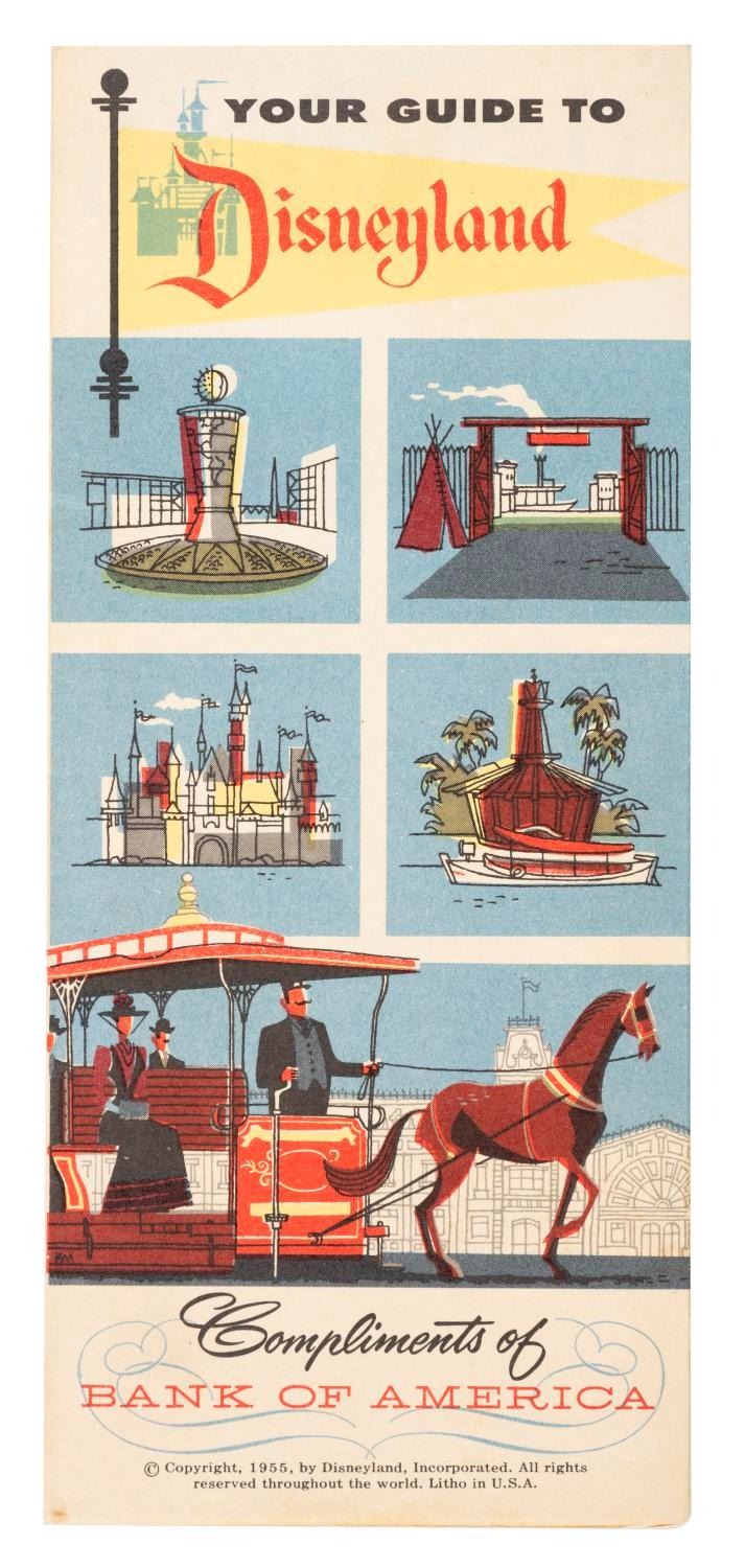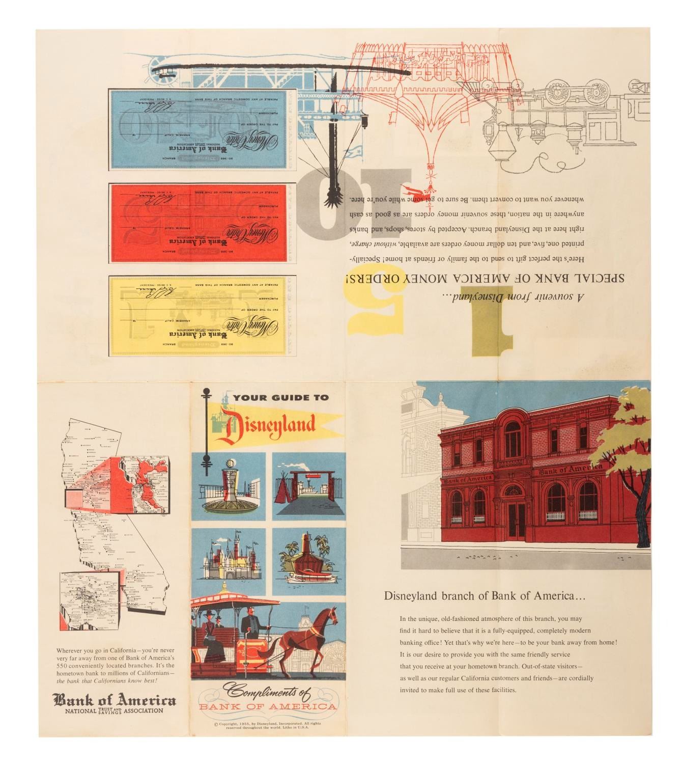 (Disneyland, 1955) An extremely rare brochure from Disneyland's Bank of America branch on Main Street with illustrations depicting the different lands of the Park on the cover, and a fold-out map of Disneyland with information on Bank of America money orders. Measuring 8" x 3.5", the brochure is in very good condition with minor discoloration from age and handling.