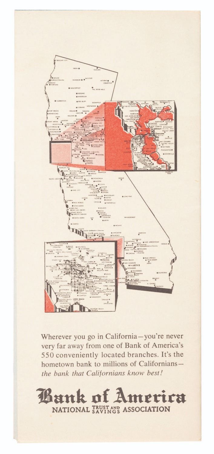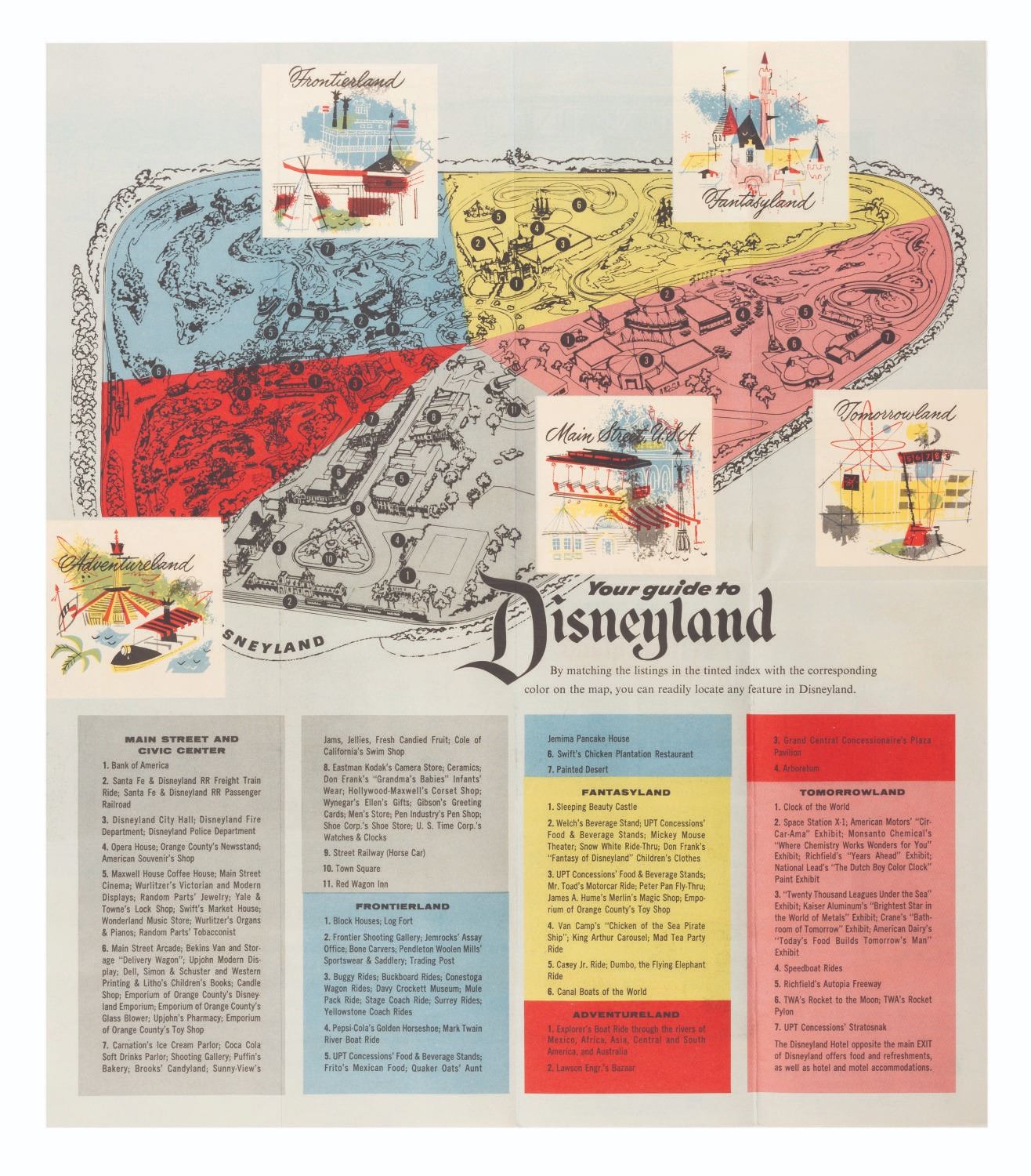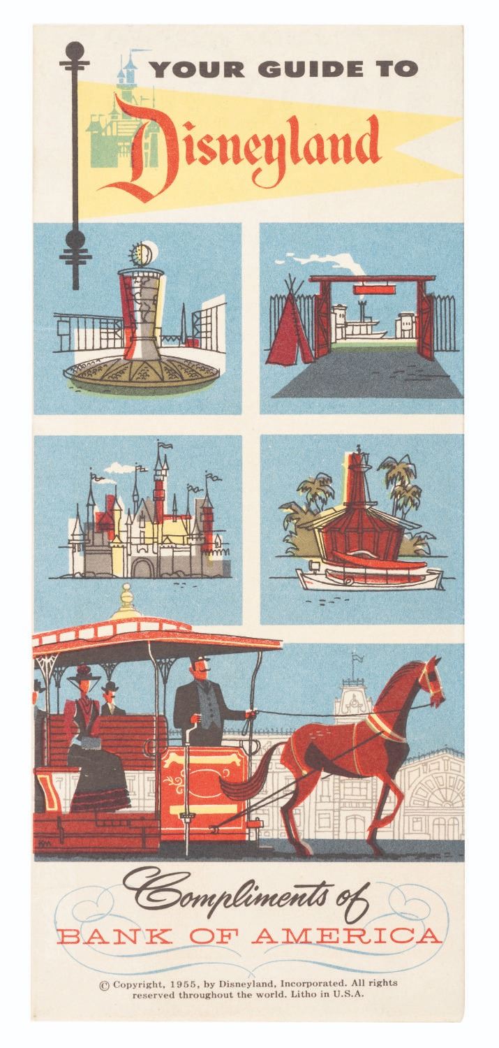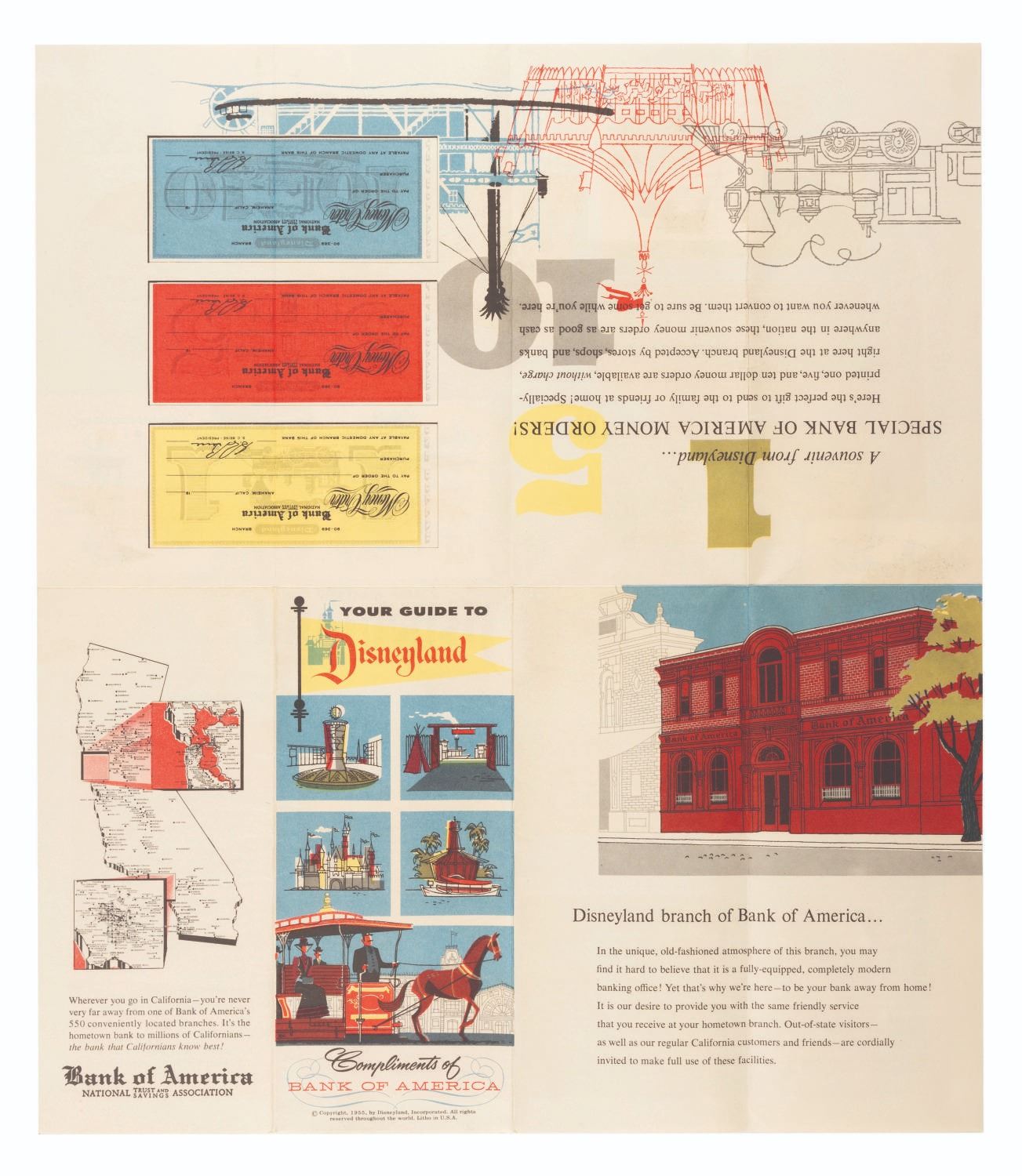 (Disneyland, 1955) An extremely rare brochure from Disneyland's Bank of America branch on Main Street with illustrations depicting the different lands of the Park on the cover, and a fold-out map of Disneyland with information on Bank of America money orders. Measuring 8" x 3.5" folded and 16” x 14” when opened, the guide is in very good condition with minor discoloration.