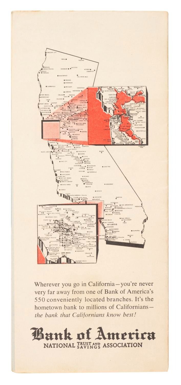 (Disneyland, 1955) An extremely rare brochure from Disneyland's Bank of America branch on Main Street with illustrations depicting the different lands of the Park on the cover, and a fold-out map of Disneyland with information on Bank of America money orders. Measuring 8" x 3.5", the brochure is in very good condition with minor discoloration from age and handling.