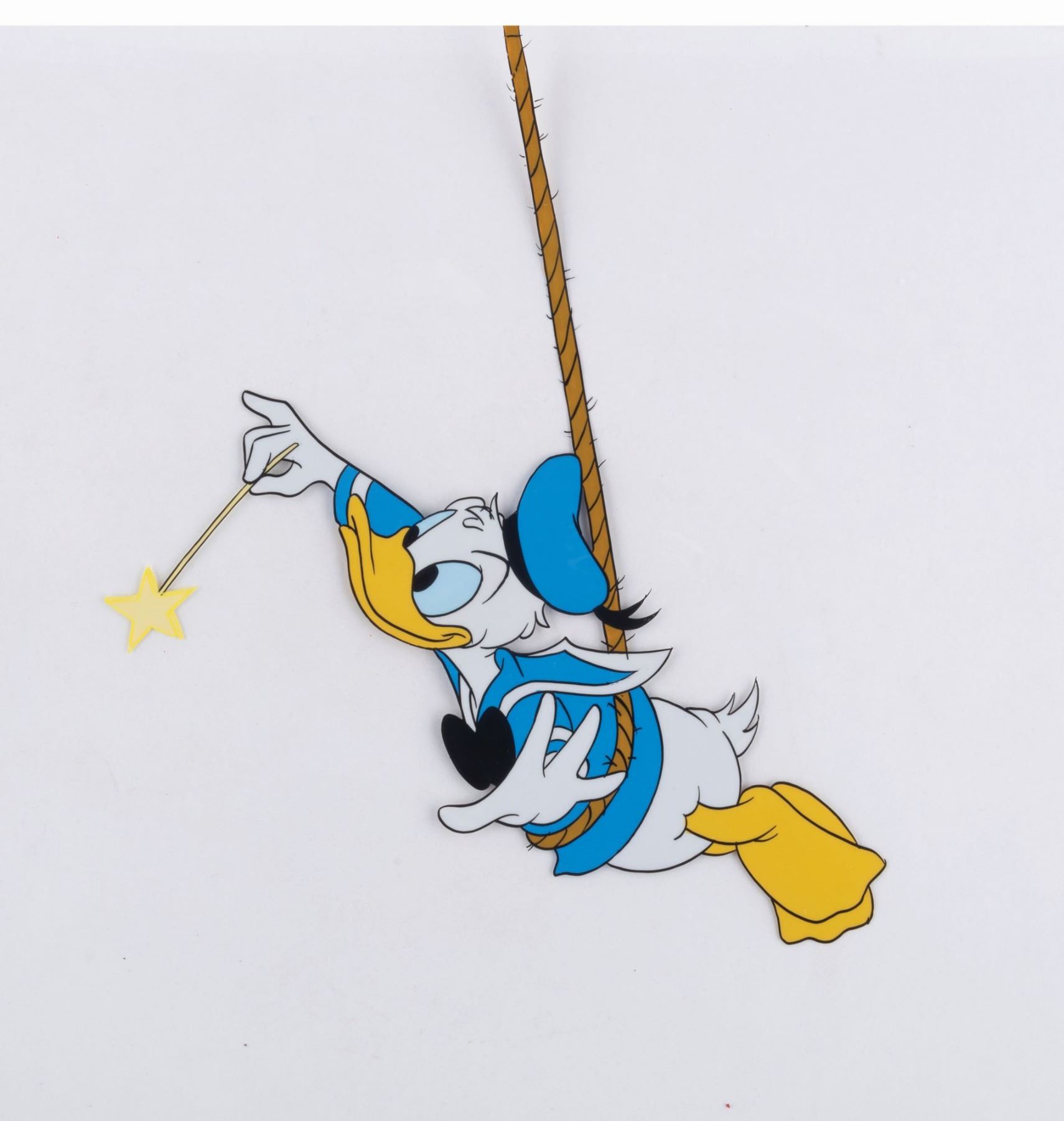 (Disney, 1957) An original production cel of Donald Duck from the "Walt Disney's Disneyland" episode "Your Host, Donald Duck." With an image size of 6.25" x 6.5" on a 10” x 13” cel, the art is in very good condition with light scratches and spots of paint loss.