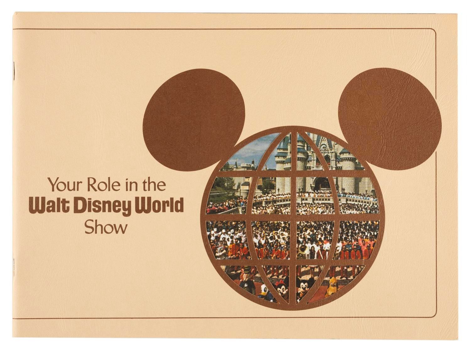 (WDW, 1975) A rare Cast Member booklet titled "Your Role in the Walt Disney World Show." This full-color booklet contains 36-pages of important new hire information and provides insight into the origins of the resort and the Walt Disney Company, as well as details on the cast and crew. Measuring 11.5"x8.5", the booklet is in very good condition with light wear to the cover.