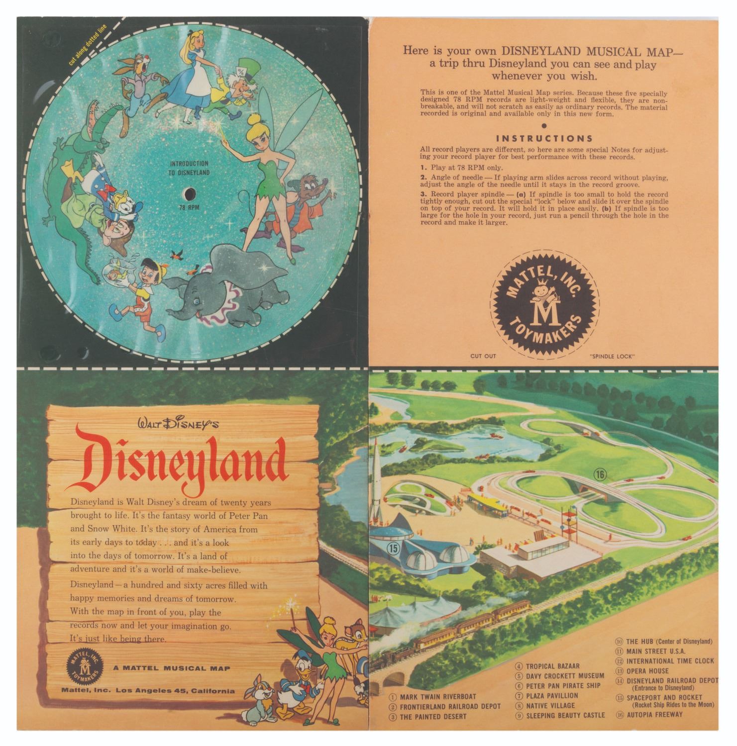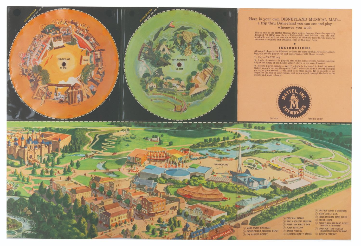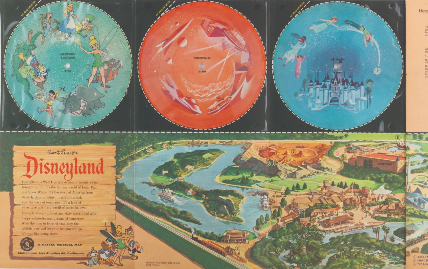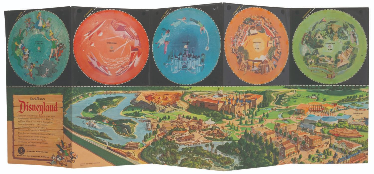 (Disneyland/Mattel, 1955) A Your Trip to Disneyland on Records Mattel Musical Map. This illustrated giant full-color panorama of Disneyland and five record set features songs themed to the original lands of the Park. Measuring 14.25” x 42.75”, the set displays in very good condition with very light edge wear.