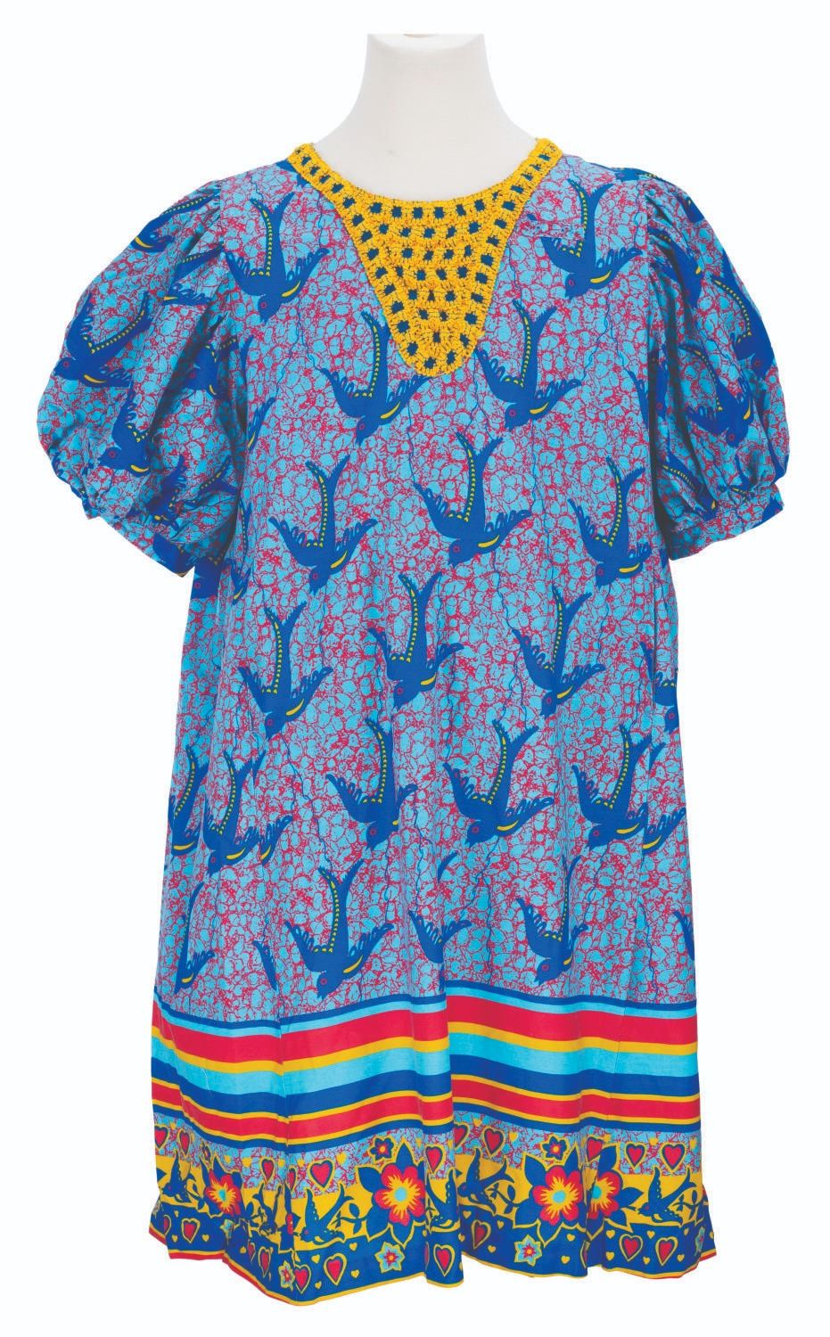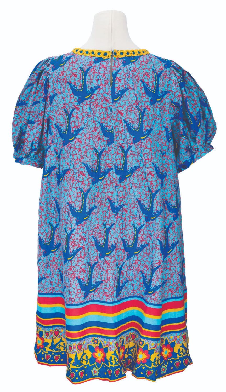 (Disney's Animal Kingdom, 2015) A colorful dress with a bird pattern, worn by Cast Members working at Zuri's Sweets Shop in the Africa section of Disney's Animal Kingdom. Labeled a size L, the Cast Member costume is in very good condition with light wear.