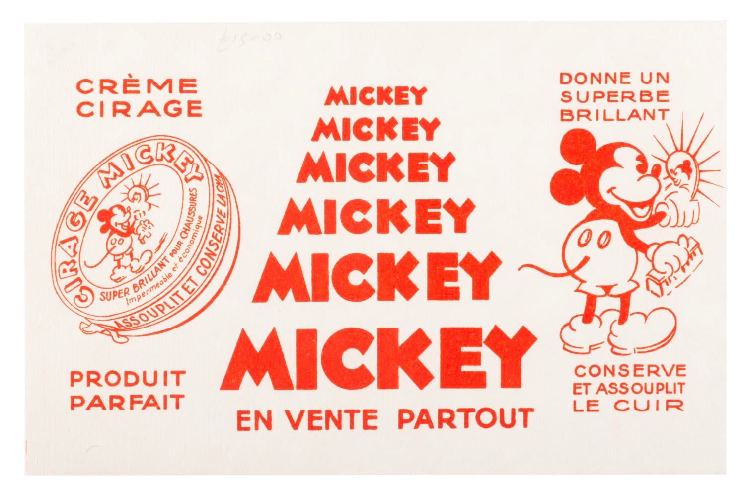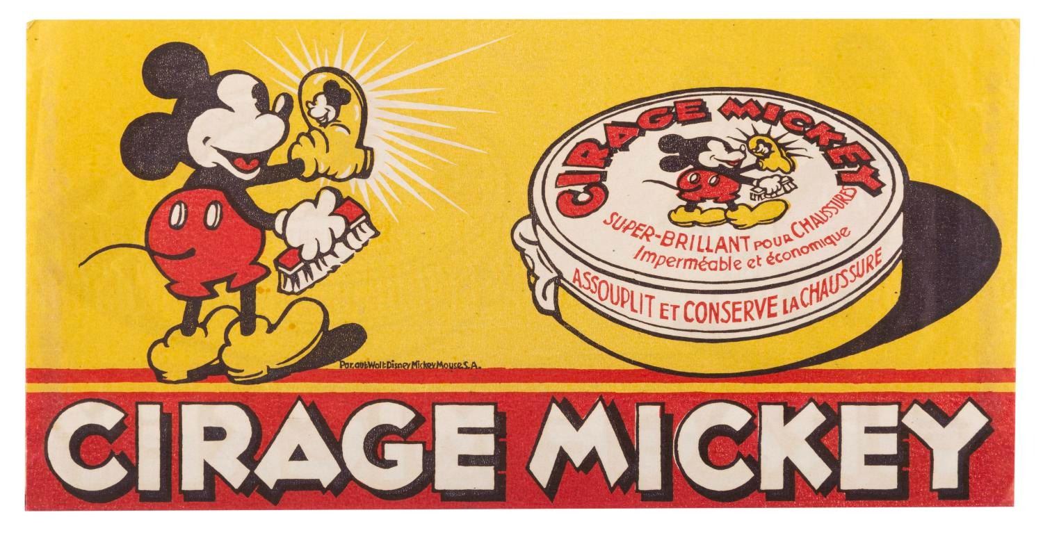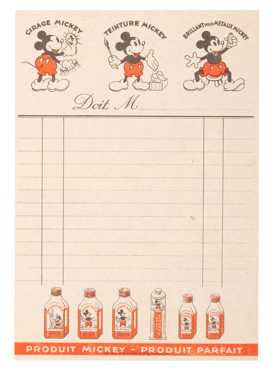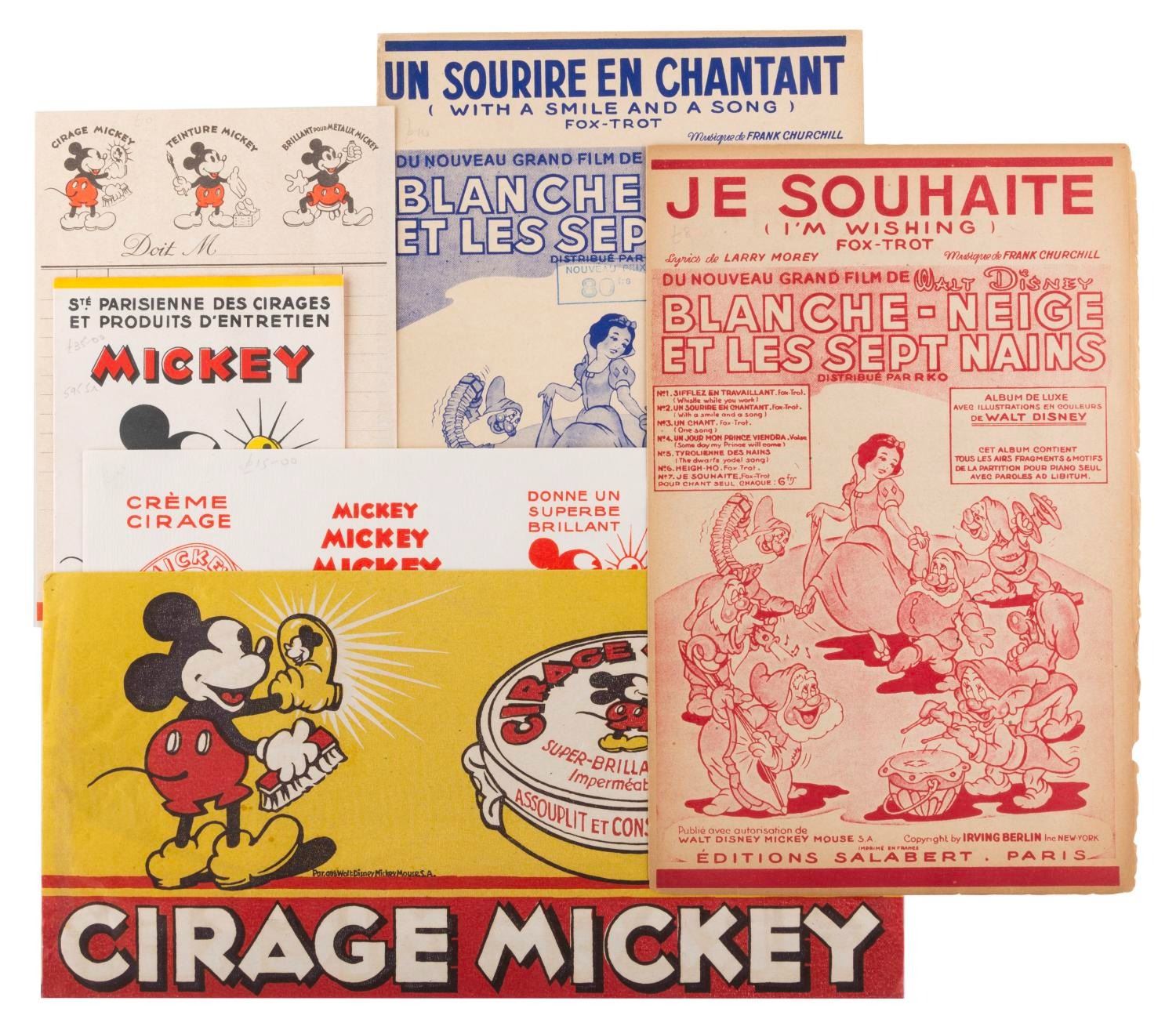 (Disney, 1930s) A collection of six unusual 1930s French Mickey Mouse promotional papers including three cleaning polish ads, an order form, and French language sheet music from “Snow White and the Seven Dwarfs." The ephemera is overall in very good condition, with the sheet music for “I’m Wishing" in good condition with light discoloration and chipping from age.