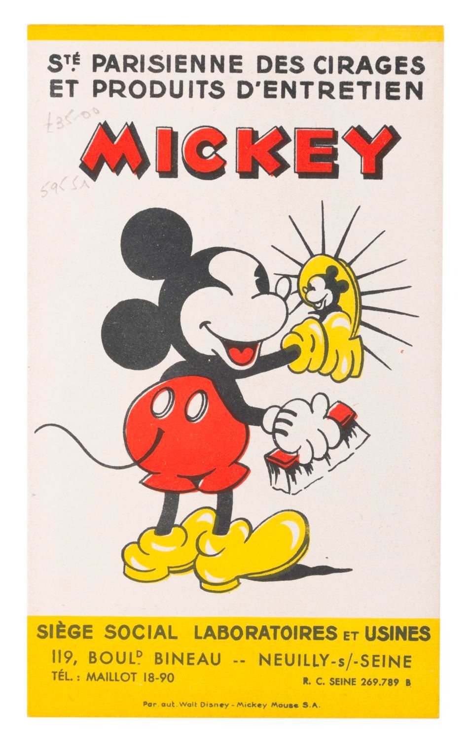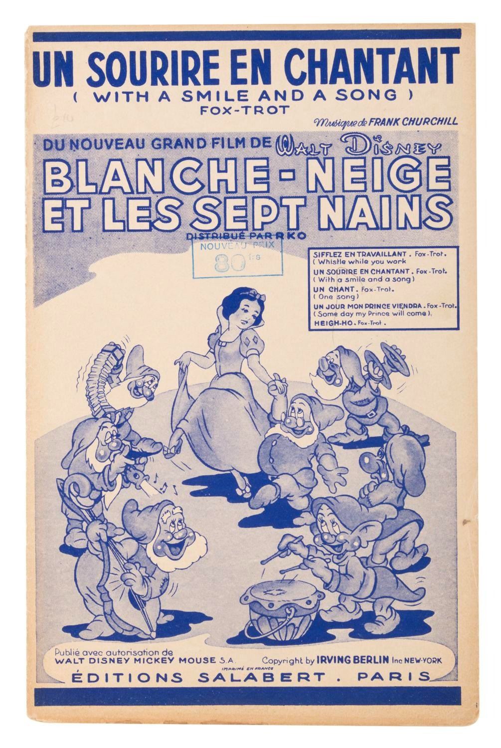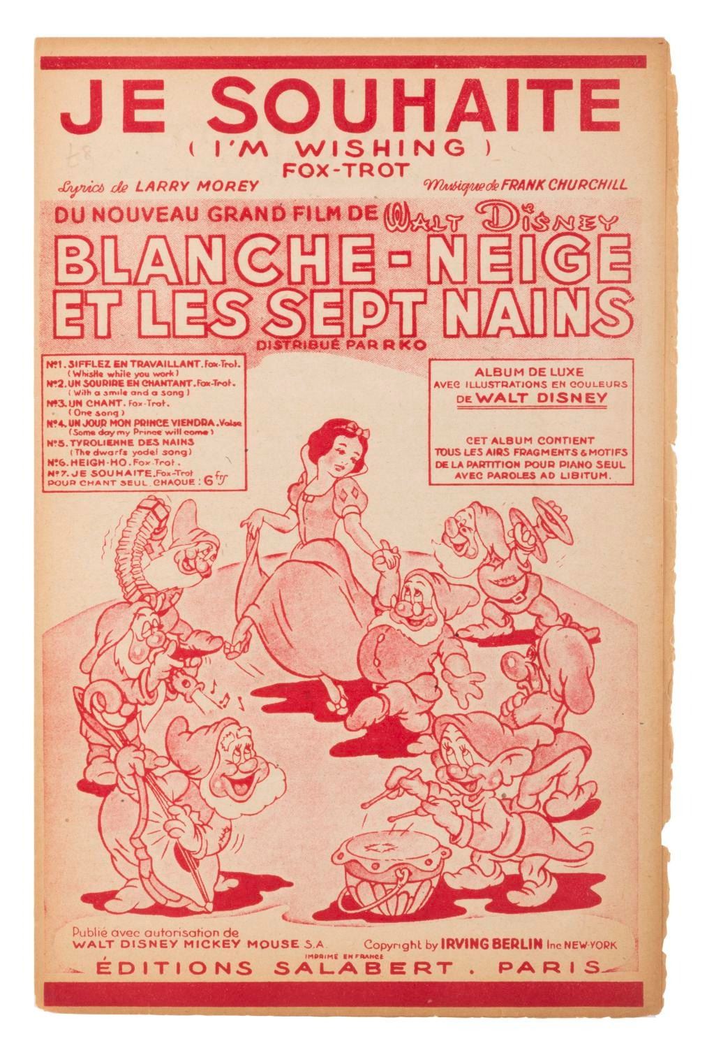 (Disney, 1930s) A collection of six unusual 1930s French Mickey Mouse promotional papers including three cleaning polish ads, an order form, and French language sheet music from “Snow White and the Seven Dwarfs." The ephemera is overall in very good condition, with the sheet music for “I’m Wishing" in good condition with light discoloration and chipping from age.