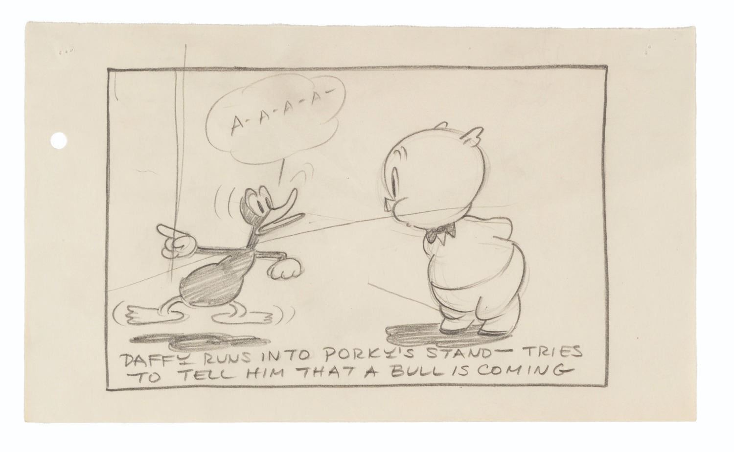 (Schlesinger, 1940) A collection of five storyboard panels featuring Porky and Daffy from the Looney Tunes short “Porky’s Last Stand,” directed by Bob Clampett. Accomplished in graphite and ranging in size from 5.5” x 9.5” to 6.5” x 9.5”, the panels display in good condition with creases and pinholes from production use and light discoloration from age.