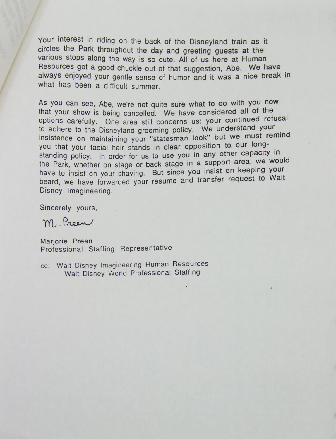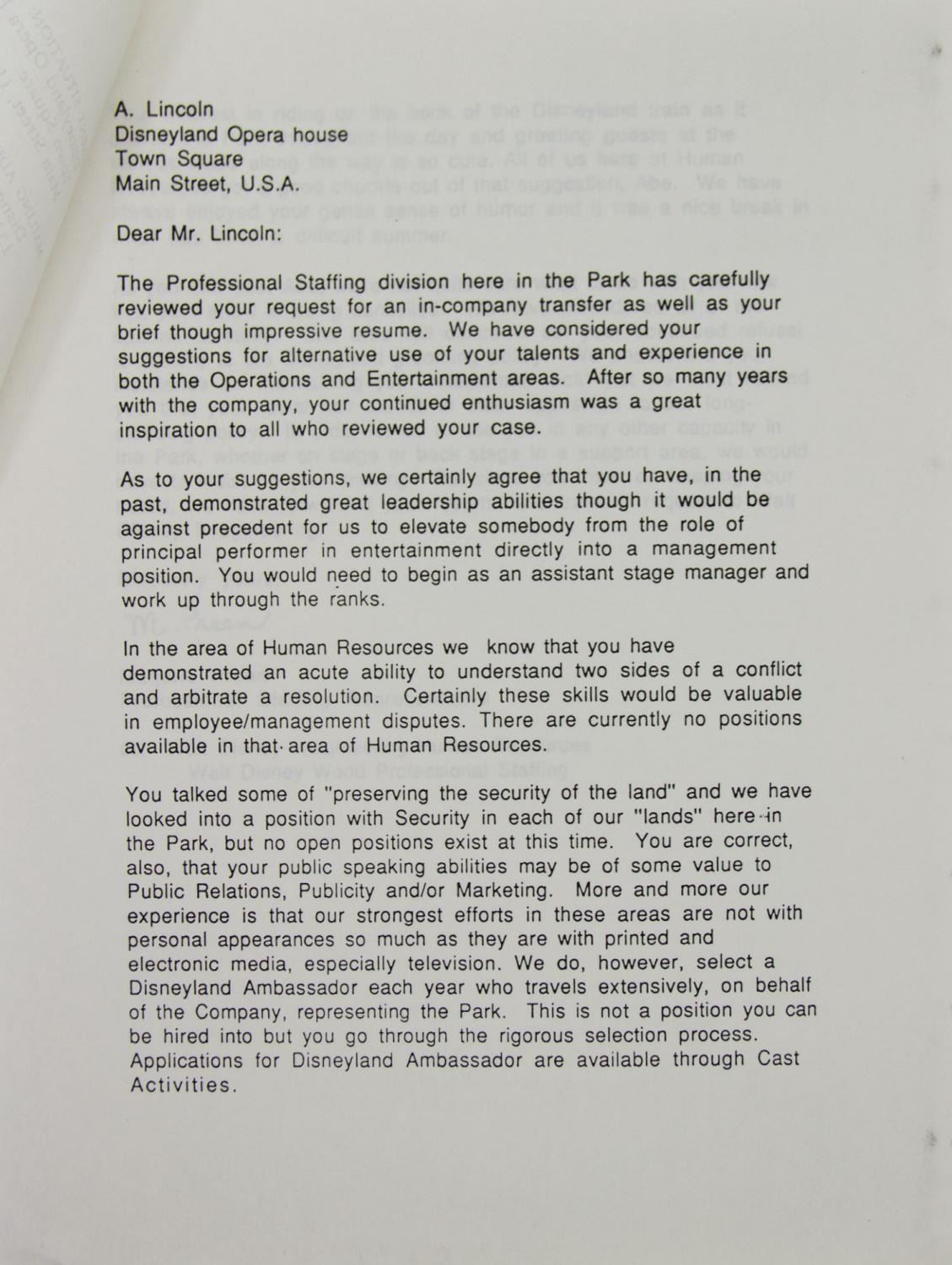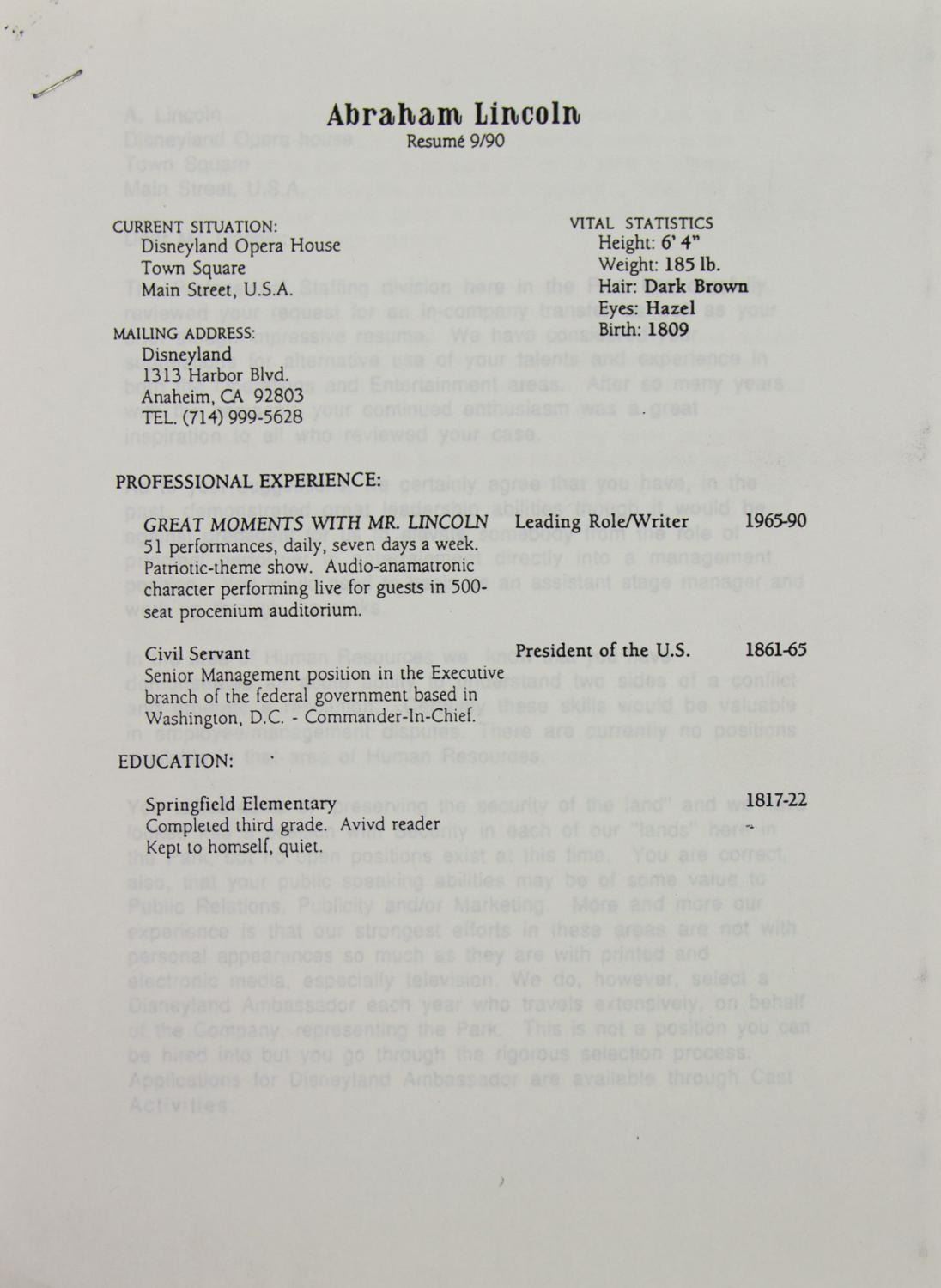 (Disneyland, 1990) An Abraham Lincoln gag resume and response letter from a Disneyland Human Resources professional created as an office joke for the amusement of Park Staff. The resume lists Lincoln's experience as an Audio-Animatronic Character and the President of the United States of America. It is stapled to a 2-page response from the Professional Staffing Division, which, in a tongue-in-cheek manner, explains why the 16th president is unqualified for all the open positions at the Park. The joke was likely created due to rumors that the Great Moments with Mr. Lincoln show was slated for cancellation. Measuring 11"x8.5", the resume and letter are in very good condition with minor handling.