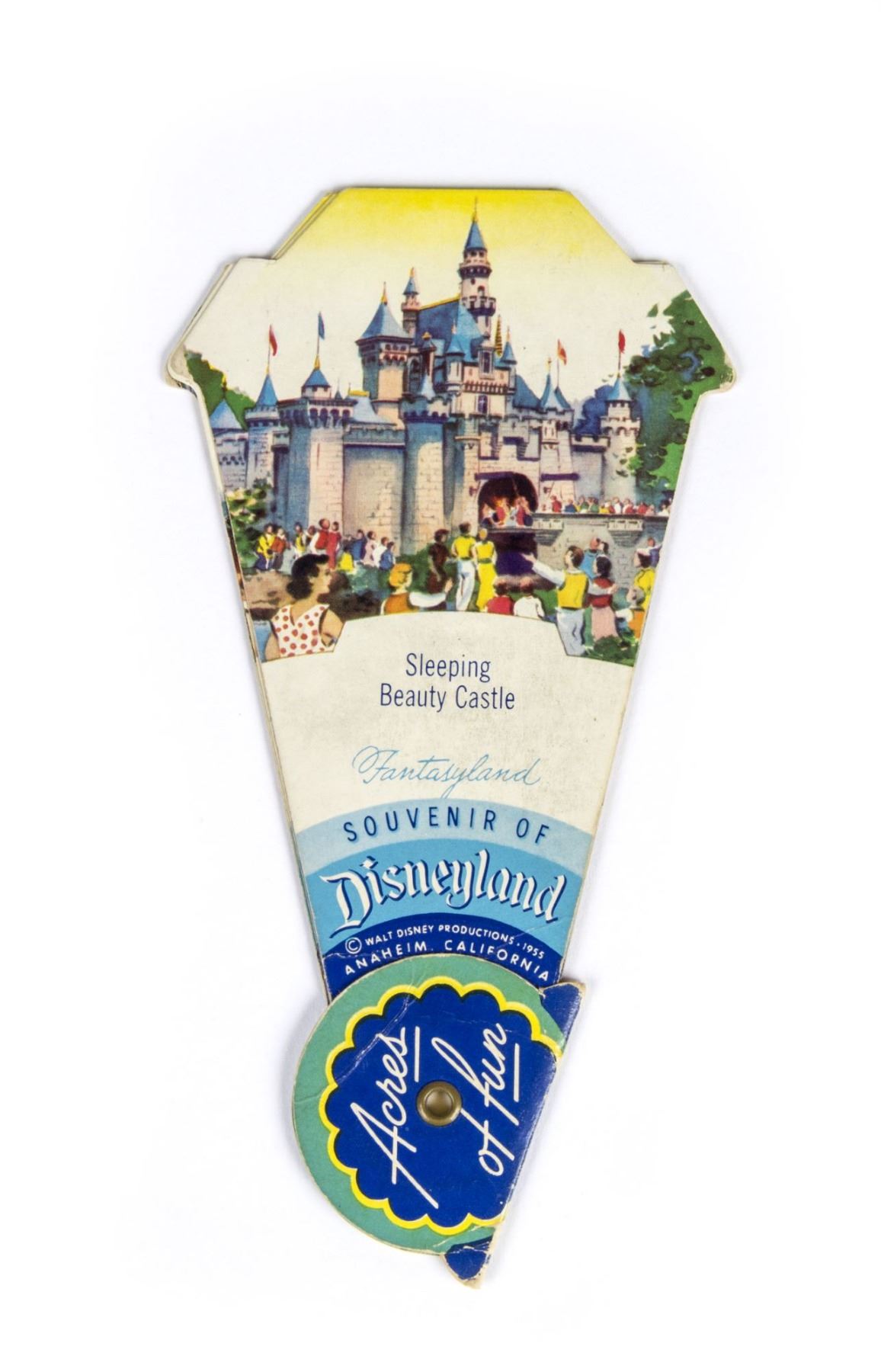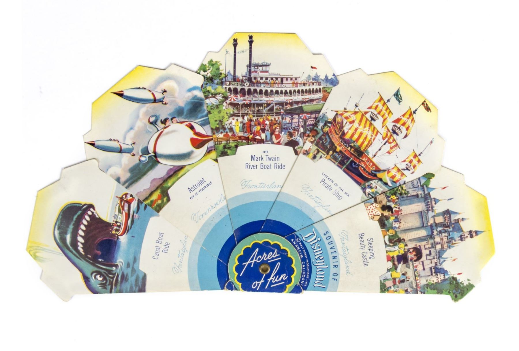 (Disneyland, 1955) A stunning piece of ephemera from the early days of the park. These folding fans were sold at many of the souvenir kiosks throughout Disneyland in 1955 and 1956. Lovingly illustrated on both sides with various attractions, this is a fantastic example of the pride and care Disney put into the promotion of the park through souvenirs. These fans were recently reissued as a replica by D23 as a member-only exclusive, but originals like these are extremely rare. The fan measures 6.75"x3.75" closed, and is in good condition with some minor creasing and surface wear from use.