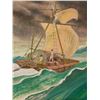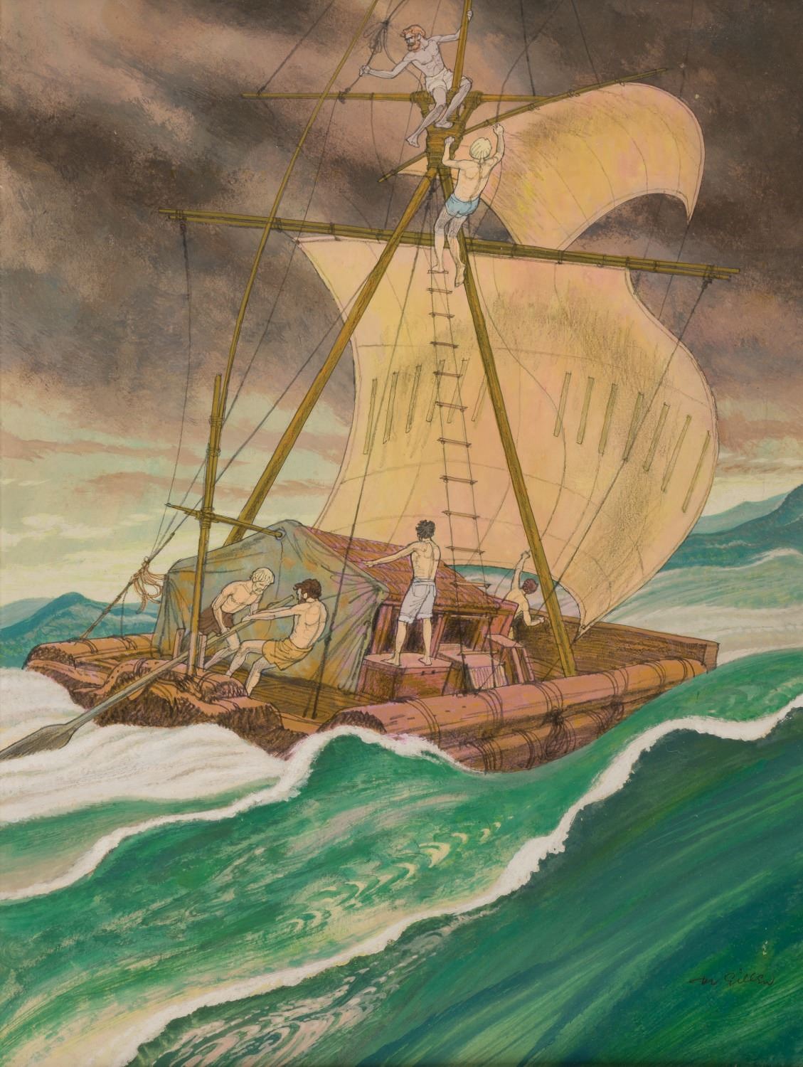 (Gillen, 1964) An original illustration by Denver Gillen of Thor Heyerdahl's "Kon-Tiki." Gillen (1914-1975) was known for his magazine illustration, landscape, and mural art. This illustration was created for an excerpt of the book published in the 1964 Grade 8 textbook "Exploration Through Reading." Accomplished in mixed media including paints and pencils, the illustration is in very fine condition, with visible image measuring 10.25"x14".