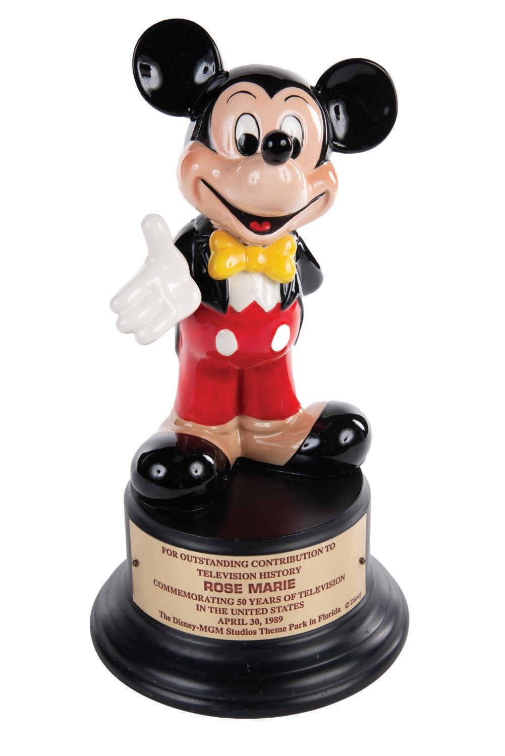 (Disney-MGM, 1989) A Disney-MGM Contribution to Television History Award presented to Rose Marie at Disney-MGM Studios. Rose Marie (best known for her role as Sally Rogers on The Dick Van Dyke Show) was bestowed the honor in a public ceremony. The piece features a hand-painted ceramic Mickey Mouse attached to a wooden base with a mounted plaque. Measuring 13" tall and 7" in diameter, the trophy displays in very good overall condition, however, the head has been broken or cracked around the neck and the piece has been repaired and repainted in the damaged area. The crack is clearly visible upon inspection. The piece still presents very well overall.