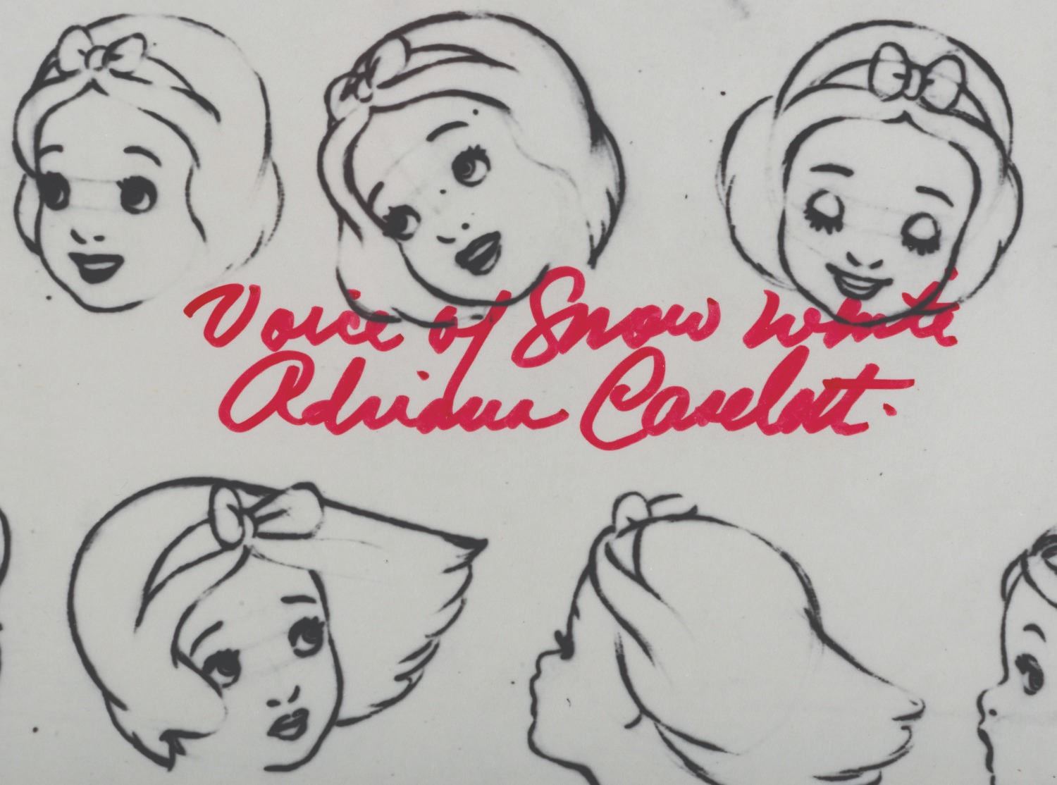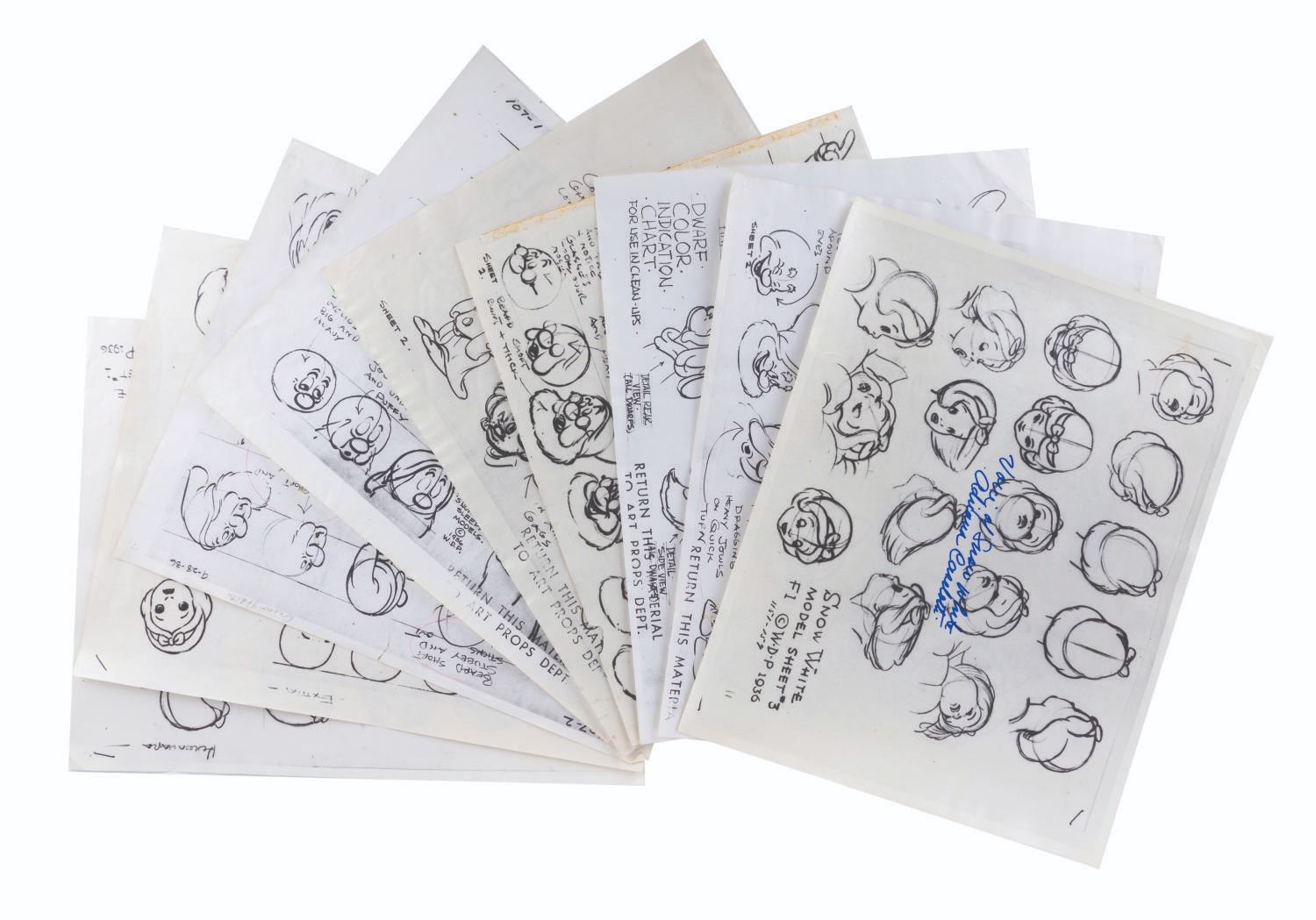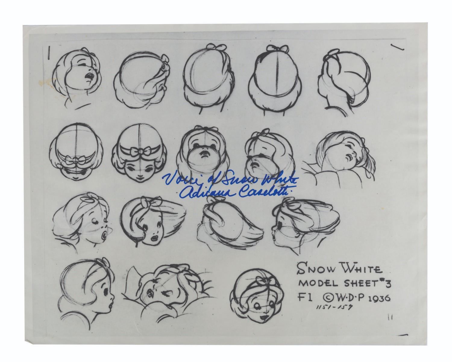 (Disney, 1951-1970) A collection of original Walt Disney Studios photostat model sheets from Snow White and the Seven Dwarfs, with three signed by Adriana Caselotti, the voice of Snow White. Model sheets were shared among animators to ensure that the character was drawn consistently by all artists. They were designed at the time of the film's production and printed through the years as tools throughout the Disney Company. The signed Snow White model sheets have dates indicating they were printed after 1951, and the (5) dwarf sheets have backstamps showing they were distributed by the Imagineering Research library in 1969 and 1970. Measuring 11"x14", the model sheets are in good condition overall, with light rippling, small creases, pin holes, and wear.