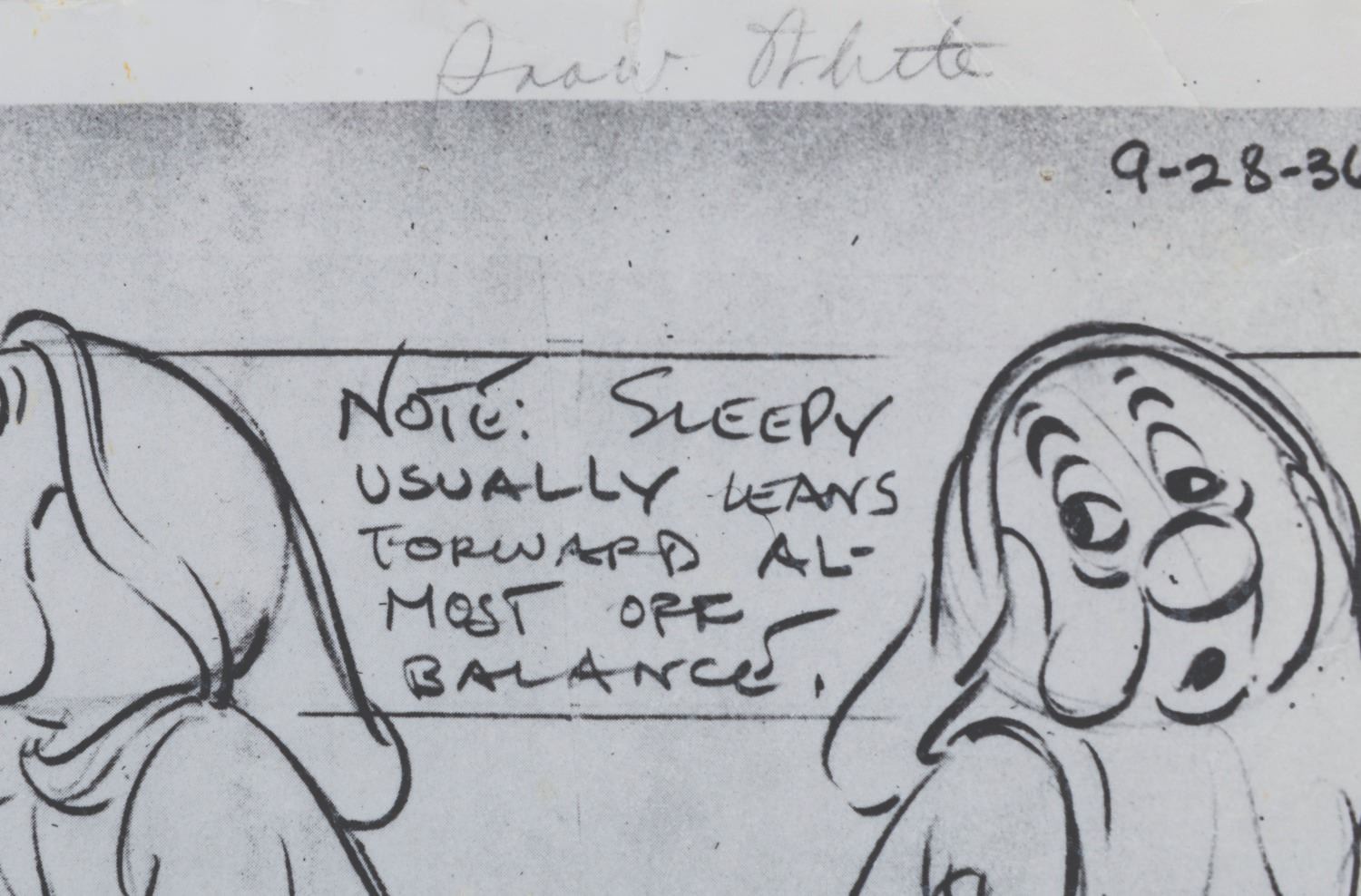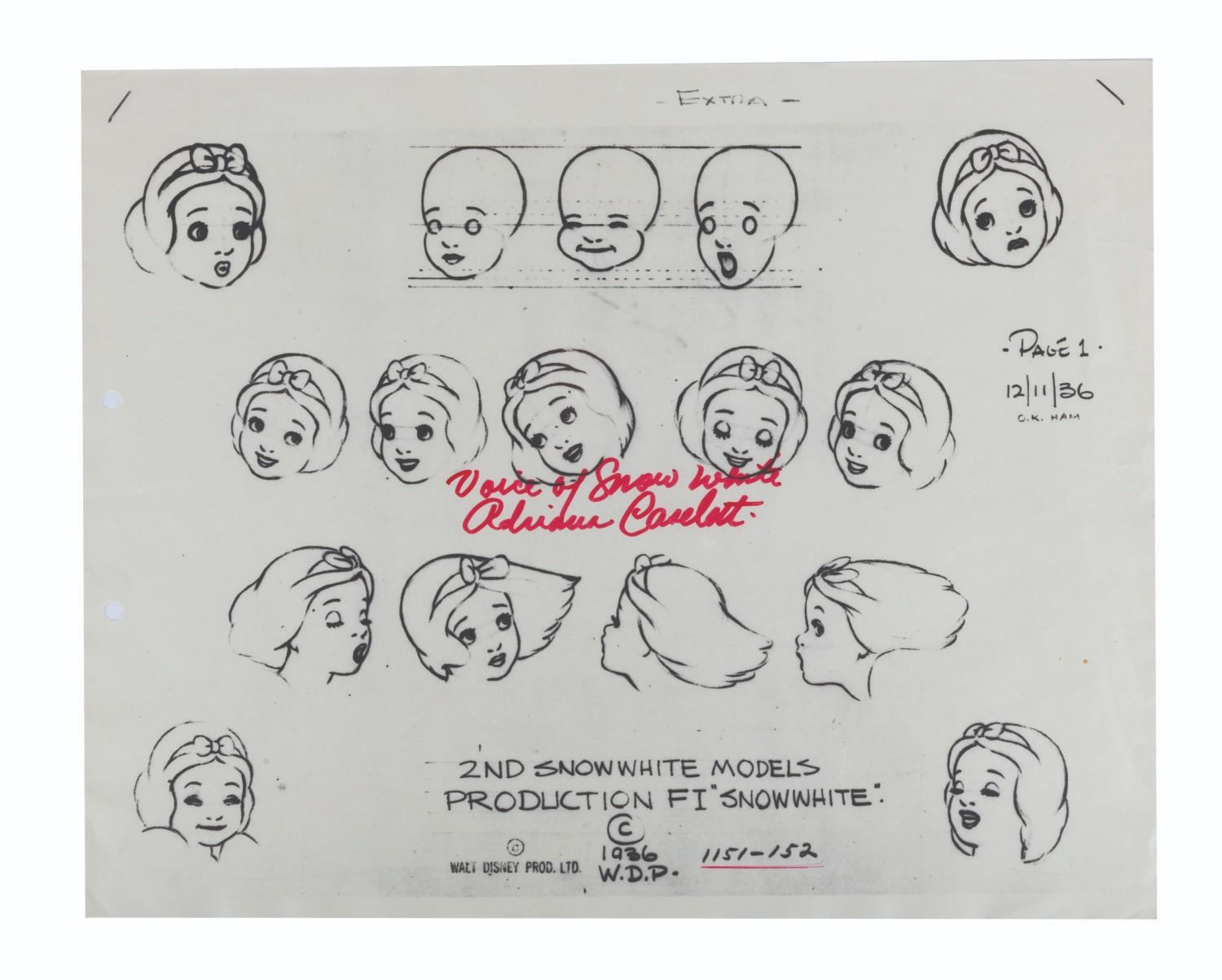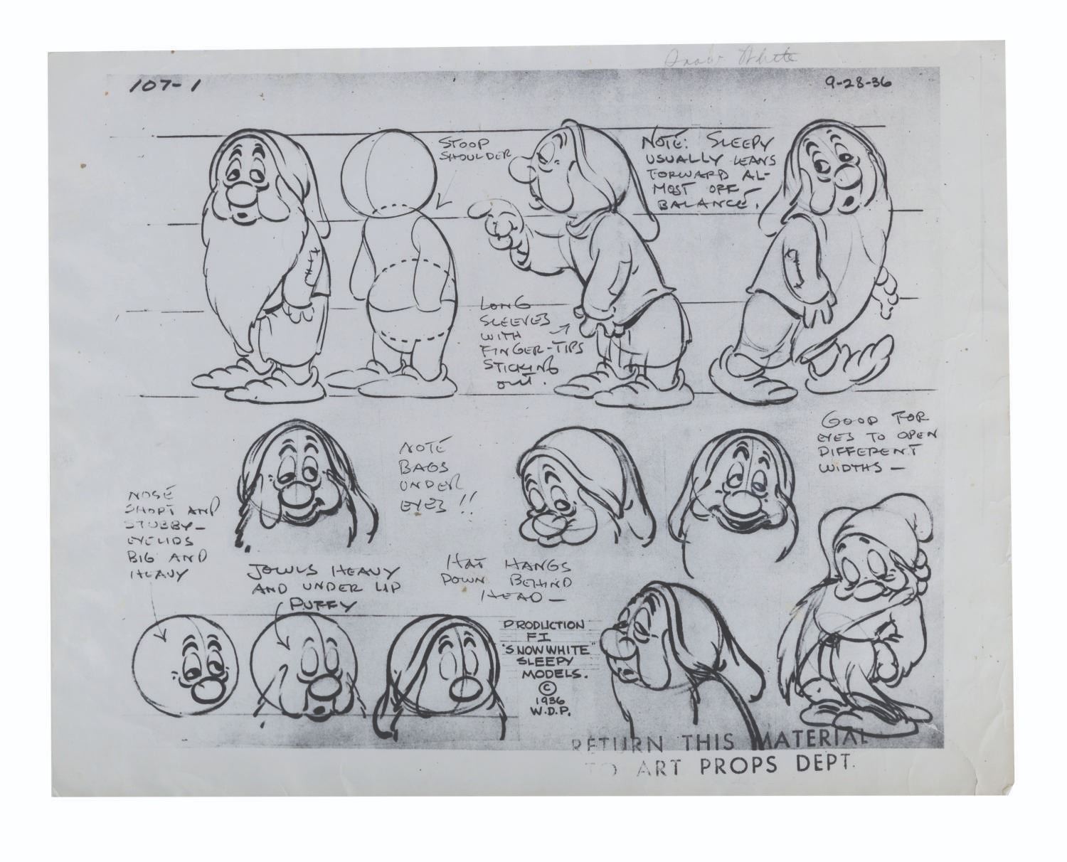 (Disney, 1951-1970) A collection of original Walt Disney Studios photostat model sheets from Snow White and the Seven Dwarfs, with three signed by Adriana Caselotti, the voice of Snow White. Model sheets were shared among animators to ensure that the character was drawn consistently by all artists. They were designed at the time of the film's production and printed through the years as tools throughout the Disney Company. The signed Snow White model sheets have dates indicating they were printed after 1951, and the (5) dwarf sheets have backstamps showing they were distributed by the Imagineering Research library in 1969 and 1970. Measuring 11"x14", the model sheets are in good condition overall, with light rippling, small creases, pin holes, and wear.