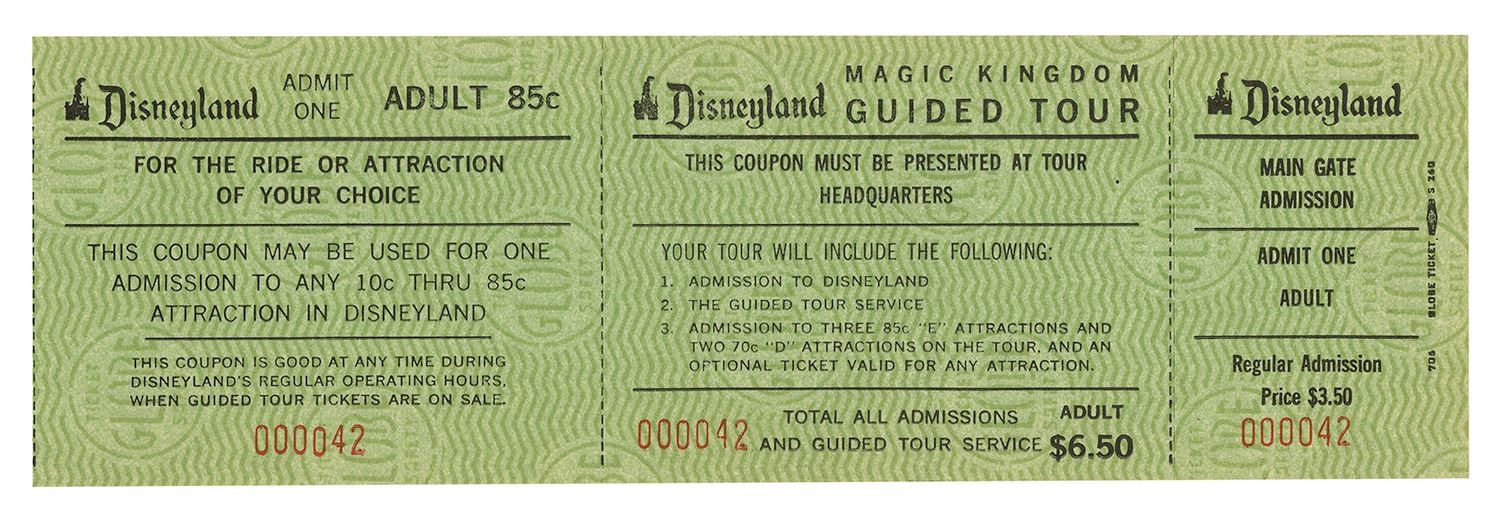 (Disneyland, 1970s) A complete adult ticket for Main Gate admission to Disneyland, a guided tour, and admission to a ride or attraction of the guest's choice. This ticket features the low serial number of 000042, and measures approximately 2.5"x8.5". The condition is very good with minor wear.