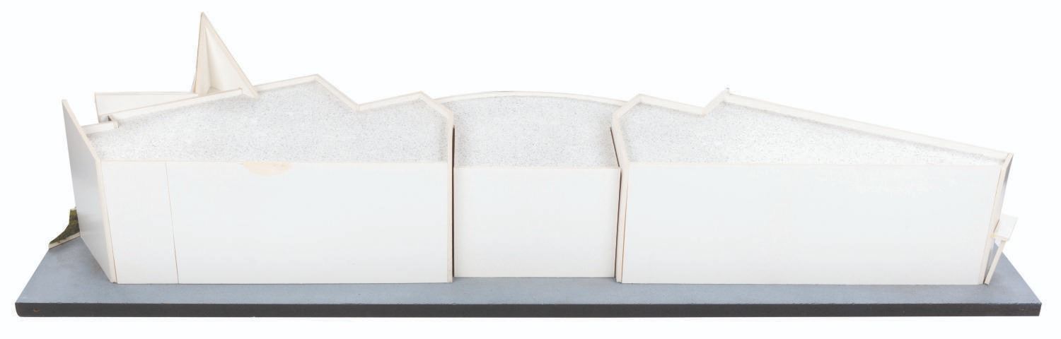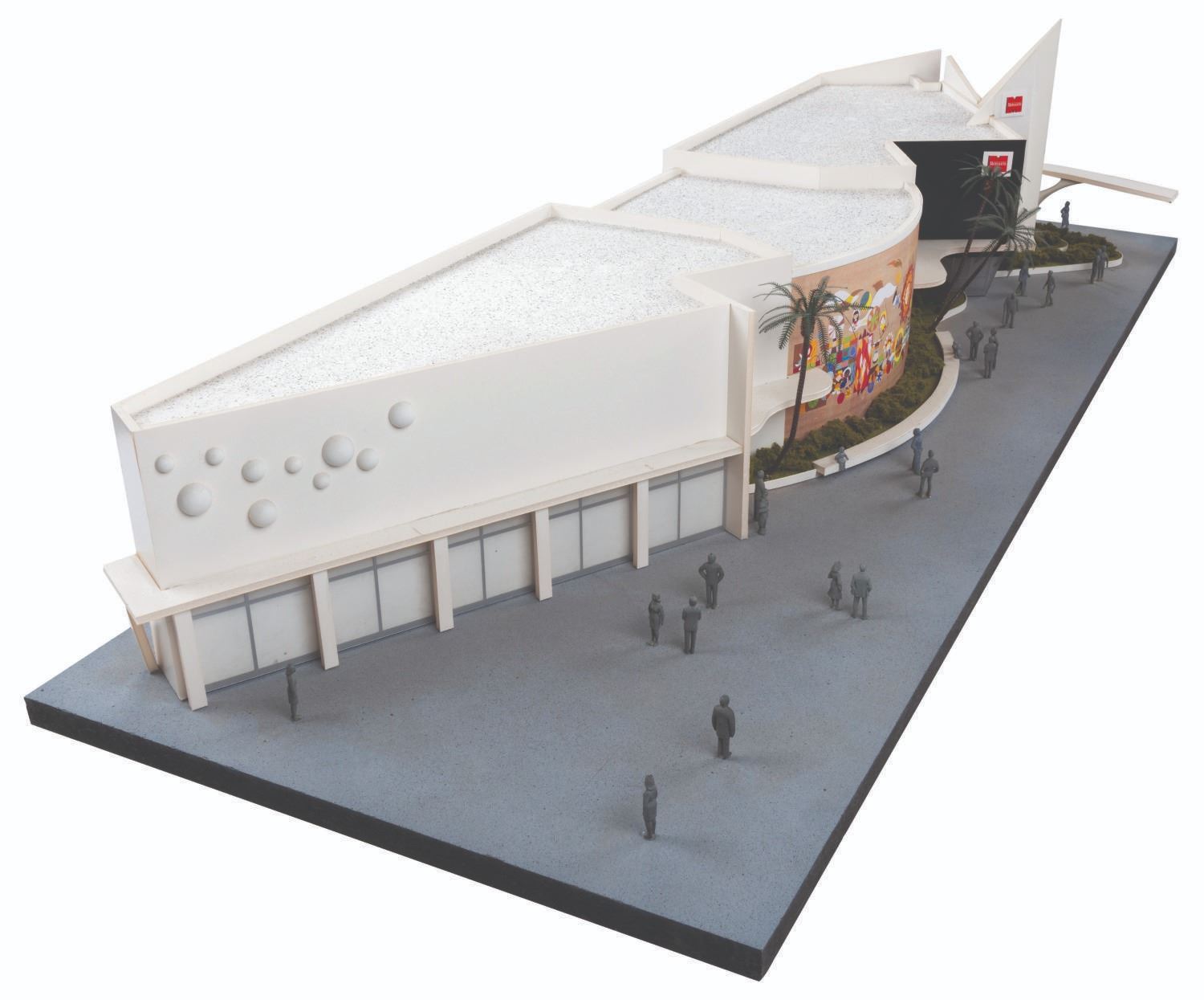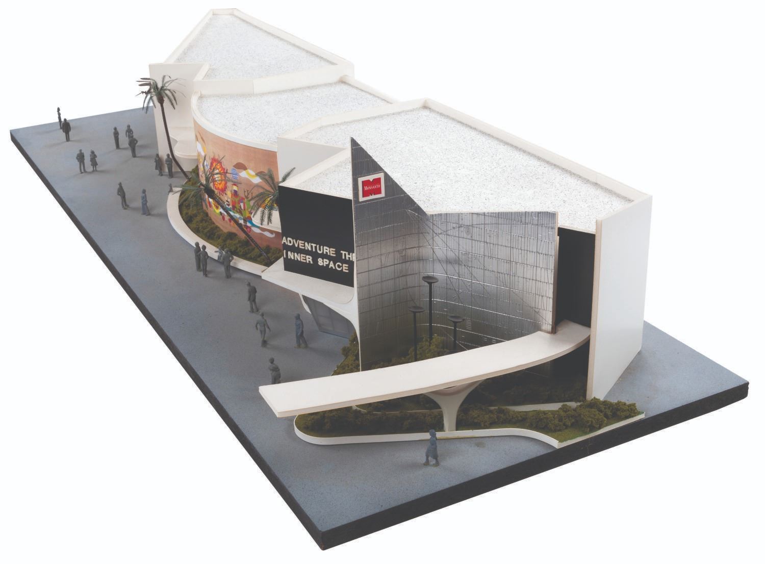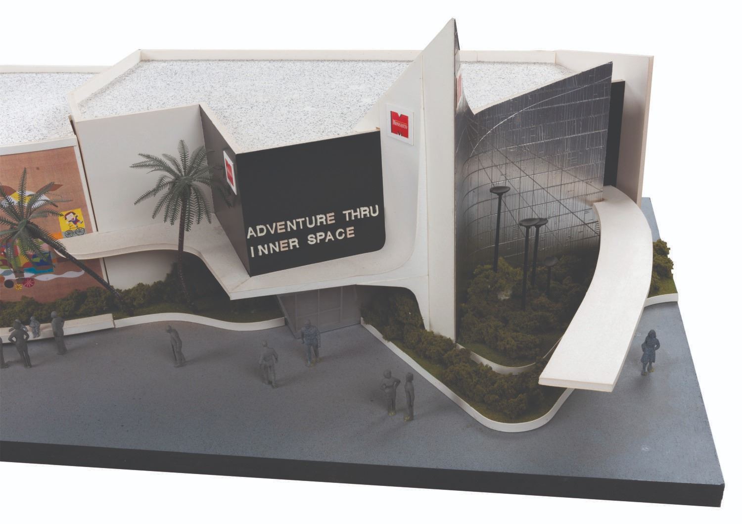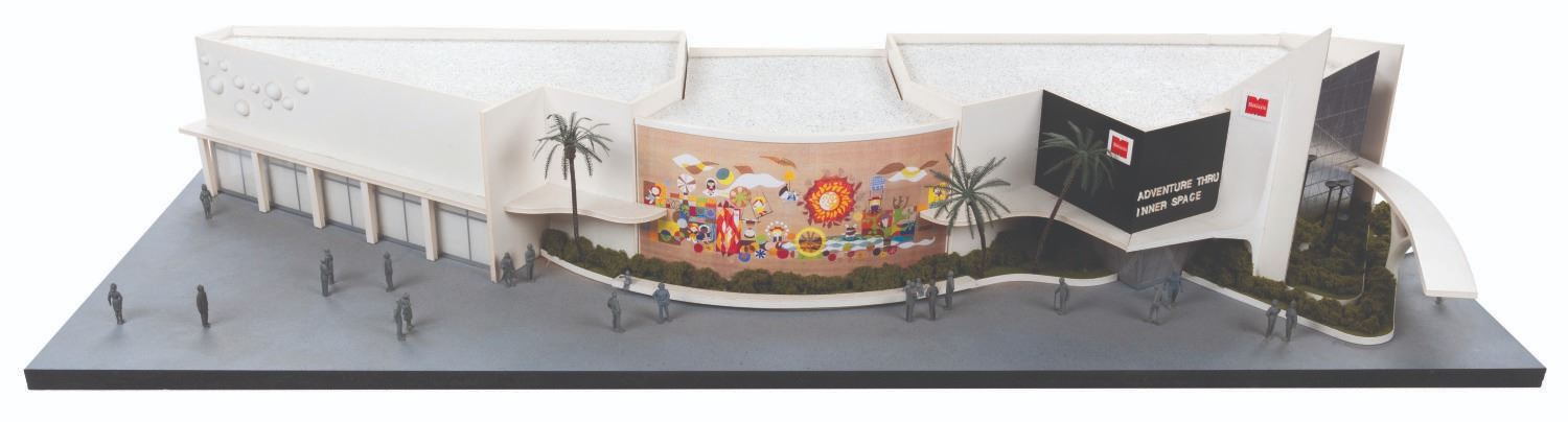 (Disneyland, 1990s) A one-of-a-kind model of the Adventure Thru Inner Space attraction and Character Shop, as they appeared in the New Tomorrowland of 1967. In 1986 these attractions were replaced with Star Tours and Star Traders, and Mary Blair’s mural covered. The model is faithful to the original designs, and is comprised predominantly of foam core with faux foliage, and 24 plastic people figures. While this is not an Imagineering original model, it was obtained from the family of an Imagineer, and truly shows a superb level of accuracy and attention to detail. With the building measuring 47.5” x 12.25” x 10” high on a 49” x 18” wooden base, this replica of the historic Disneyland attraction is in fine condition, with expected light wear to materials from handling and age.