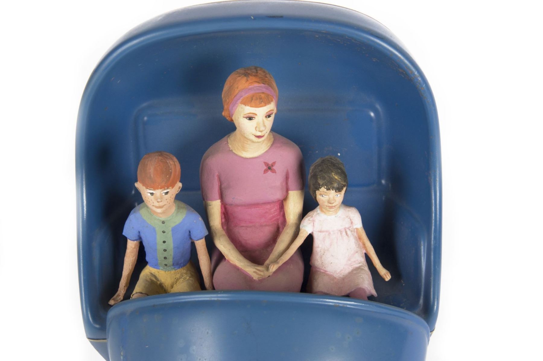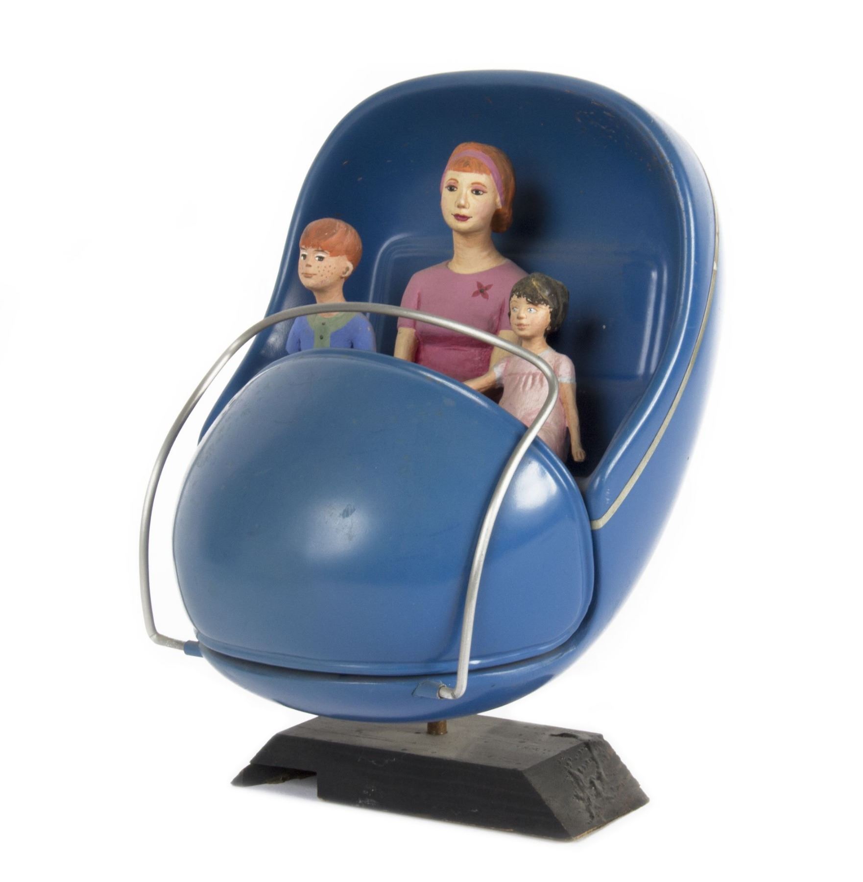 (Disneyland, c.1967) An extremely rare "Atommobile" prop from Disneyland's "Adventure Thru Inner Space". While waiting in the attraction's queue, guests could watch as their fellow adventurers boarded their vehicles and would amazingly begin to shrink to the size of an atom. This original prop from the attraction features three guests aboard their shrunken atommobile, with each guest hand-painted and adhered within the vehicle. This particular prop comes from one of the viewer displays located throughout the line queue that gave guests a wonderful look at the shrunken vehicles. These display pieces are modeled differently from the other prop shrinking pieces throughout the attraction and are extremely rare. The atommobile measures approximately 9" tall and 6.5" in diameter, and is displayed on a wooden base. The condition is good overall with some small scuffs and dings throughout the prop from use, as well as some scattered spots of discoloration inside the atommobile.