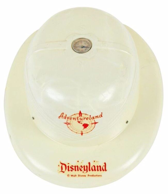 (Disneyland, c.1957) A very rare souvenir hat from Adventureland featuring a working compass on the top of the hat. The hat features an early Adventureland logo on the front above the Disneyland logo on the brim. The hat still retains its fabric straps inside and is a beautiful example of this rare Disneyland souvenir. This item measures 11.75"x9.25" and 4.5" tall. The hat is in good condition with some minor scuffing and wear from age, including some dings to the top of the hat and a thin 0.5" crack on the right side.
