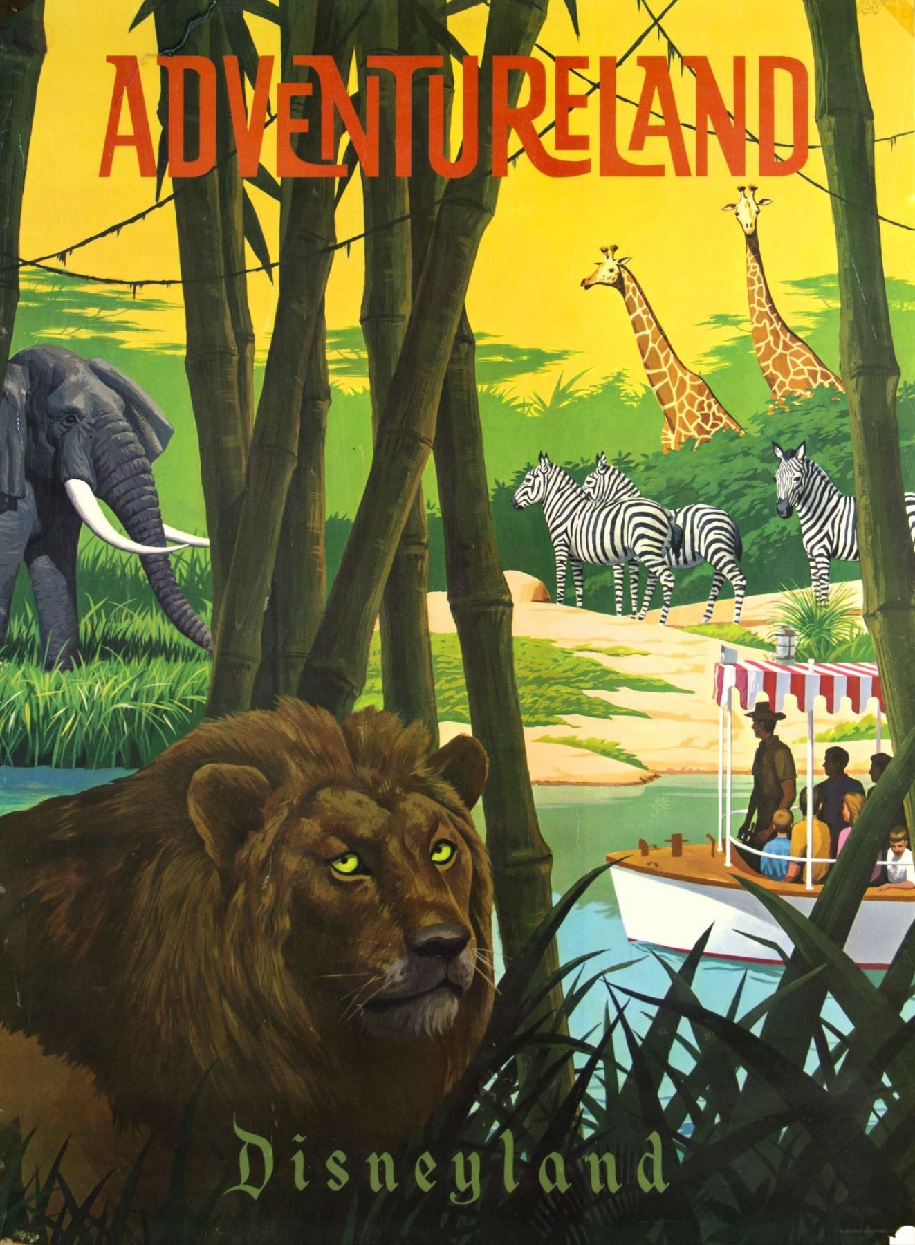 (Disneyland, 1966) A very scarce “near-attraction†poster from the Summer of 1966. This beautiful printed poster was part of a set of six posters that were actually displayed in the park as attraction posters but also sold individually at the Main Street Emporium. They were only available that Summer and as such, are very hard to come by. This poster measures 30"x22" and is in fair condition with some edge and corner-wear including a repaired tear along the top-edge, and a few worn spots on the back of the sheet. The poster has been laminated for its protection.