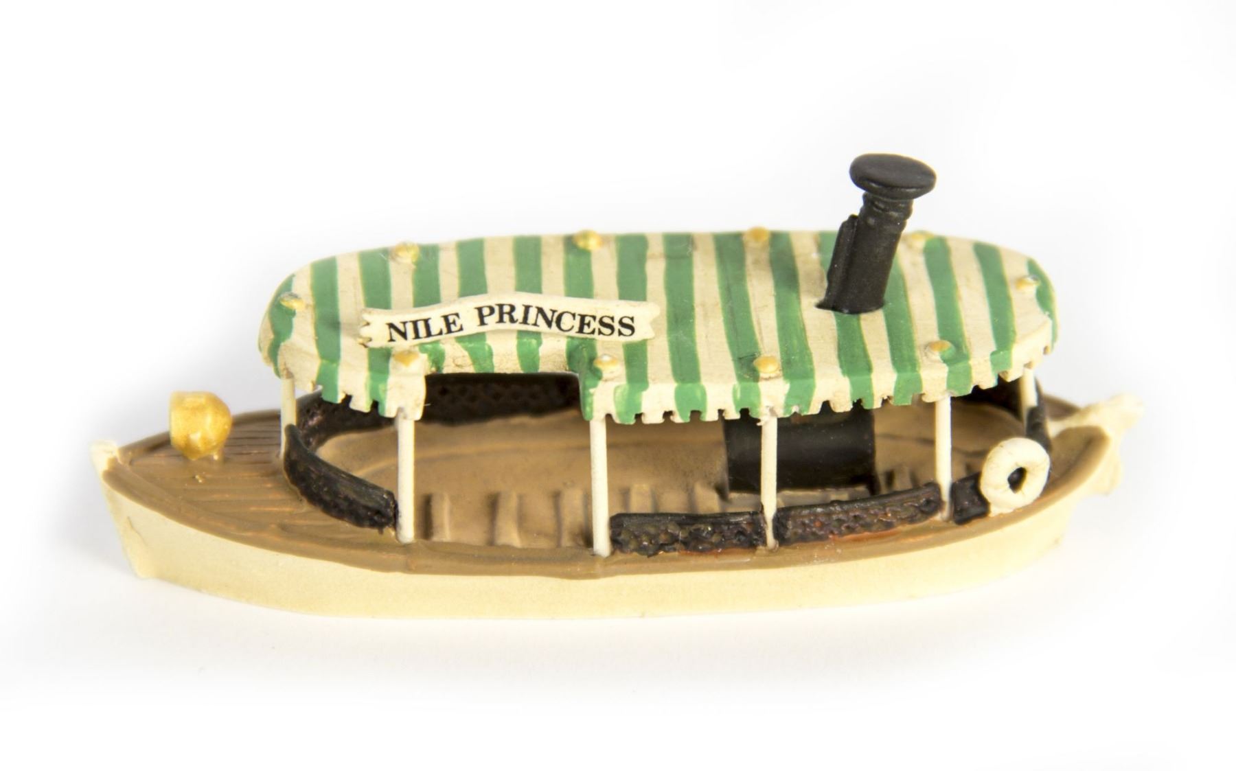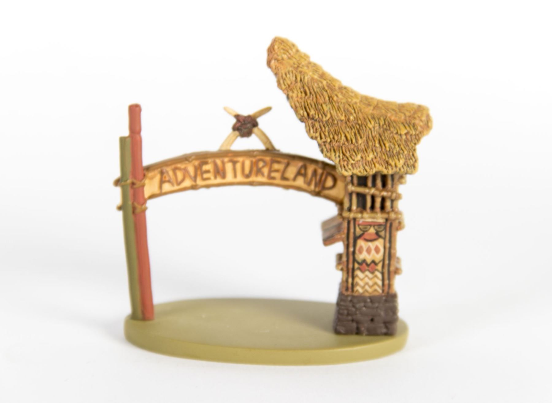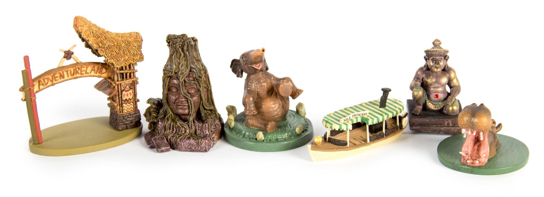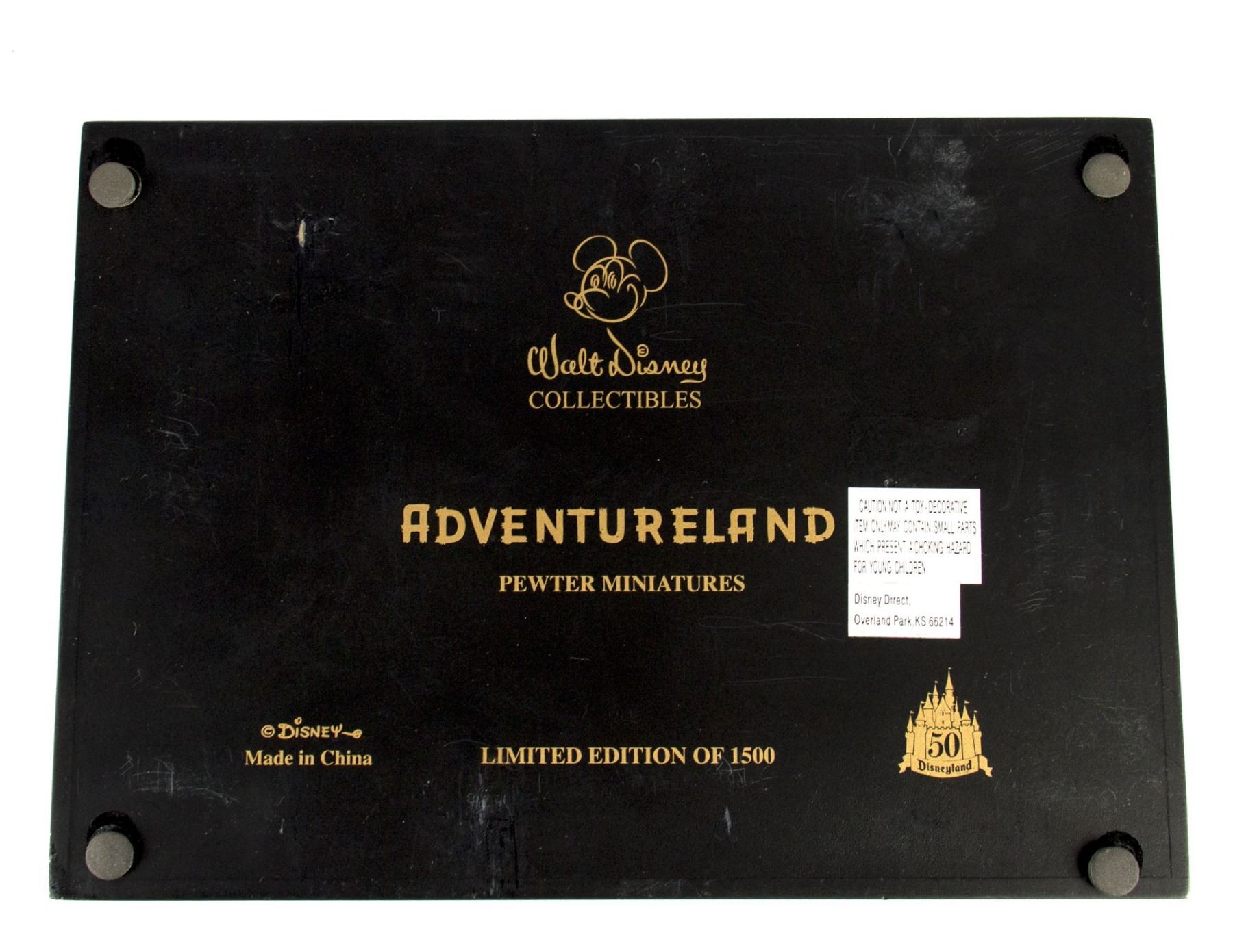 (Disneyland, 2005) This limited edition boxed set of Adventureland-themed pewter miniatures was created by Kevin Kidney and Jody Daily for Disneyland's 50th Anniversary. This set was limited to 1500 pieces and includes miniatures of: the "Nile Princess" boat, a Head-shaped Shrine, the entrance to Adventureland, a Monkey Shrine, an Elephant, and a Hippo. This boxed set measures 7"x10" and 3.5" tall, and is in very good condition with some scuffing to the box.