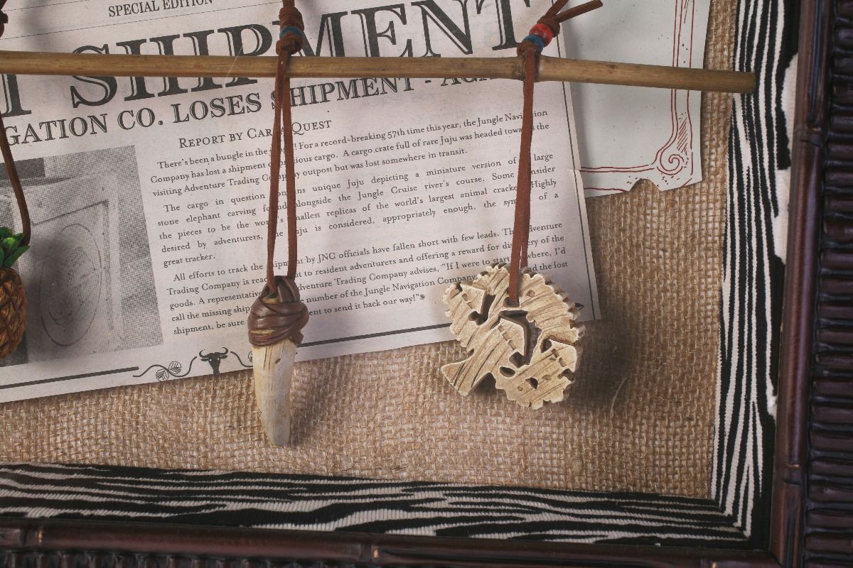 (Disneyland, 2010s) Custom framed set of (9) "Jujus" from a special scavenger event at the Adventureland Trading Company in the Indiana Jones Outpost. Park guests could go on a series of quests and would be rewarded with a custom themed "Juju" artifact. Some of the quests were more difficult than others, and thus, some of these "Jujus" are difficult to come by. This is a complete set of all (9) "Jujus", and a separate rare skull-shaped "Juju" that was only given out as part of a closing-ceremony event for the Adventureland Trading Company, and as a special D23 promotion. The "Jujus" are displayed hanging in front of the flyers and leaflets that adventurers would use in their quests to obtain the rare "Jujus". Measures 19.5"x21.5" and 3.5" thick framed. In very good condition.