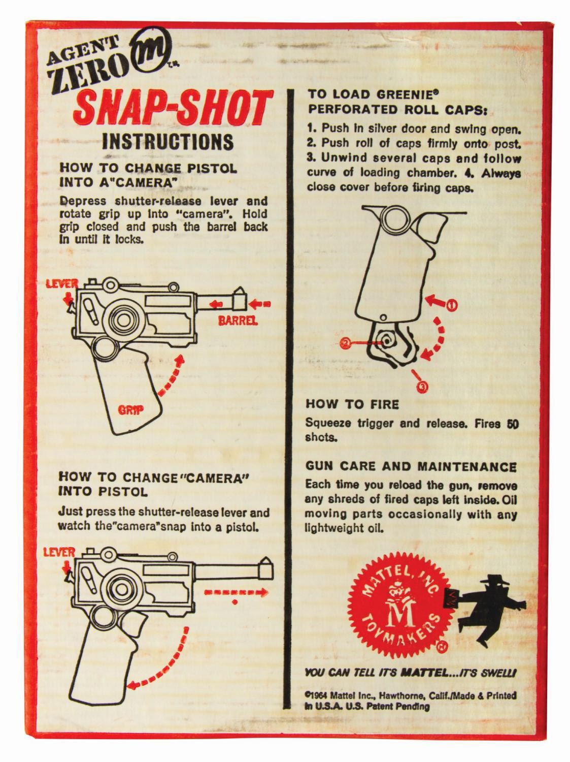 (Mattel, 1964) A vintage Agent Zero Snap-Shot spy toy manufactured by Mattel. The Snap-Shot transforms from a firing cap gun into a toy camera. Measuring 8"x11.25" and 1.75" deep, the original box is in fine condition with minor discoloration to the reverse. The Snap-Shot is also in fine condition, exhibiting only minimal surface wear.