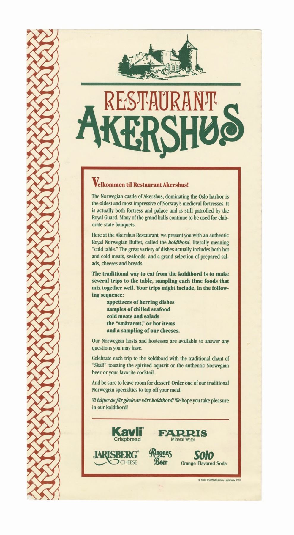 (Epcot, 1988) An opening year menu for the Akershus Restaurant in the Norway Pavilion of Epcot. Situated in a reproduction Stave church, the restaurant offered diners an authentic Royal Norwegian "koldtbord" buffet experience. The front of the menu provides instructions for guests and the reverse features the wine list. Measuring 12"x6", the menu is in good condition and exhibits some edge and corner wear.