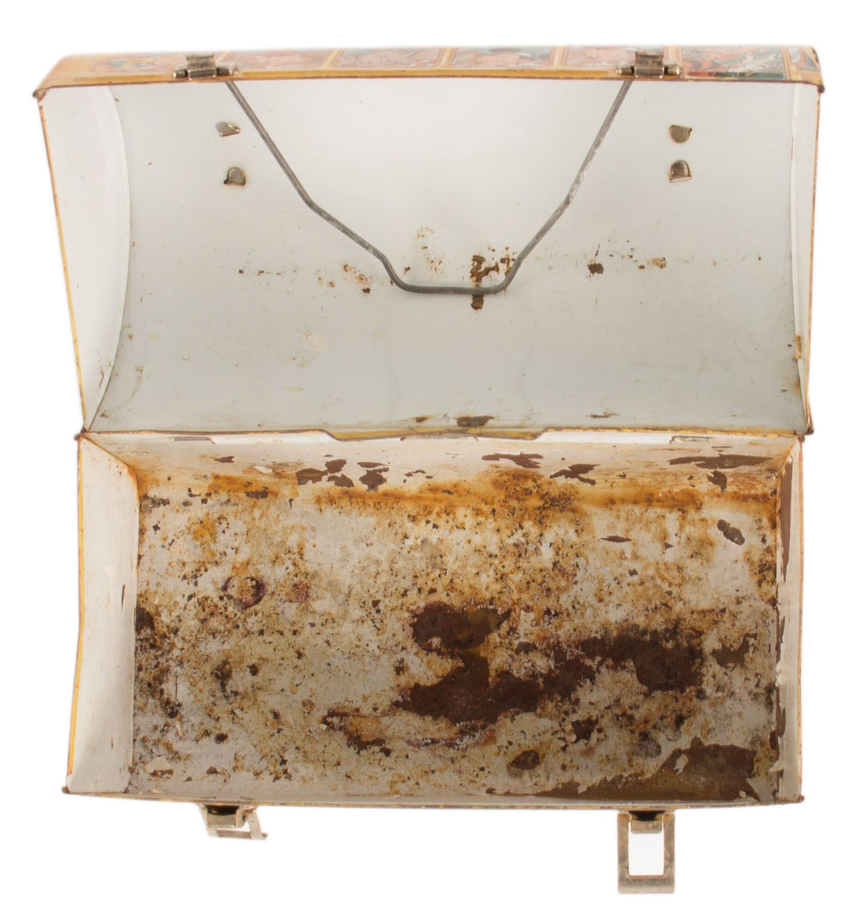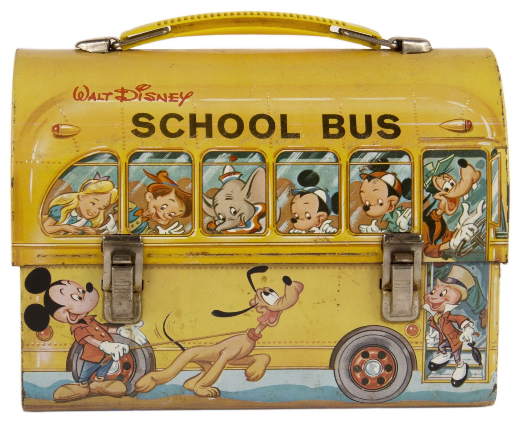 (Aladdin, c.1950s-60s) A classic metal Disneyland lunchbox featuring a school bus design with iconic Walt Disney characters peeking their heads out of the windows. The lunchbox measures 7"x9" and 4.5" deep, and is in good condition. The exterior shows some wear to the paint, particularly around the edges and rim of the lid. The interior has heavy rusting throughout the bottom half of the box.