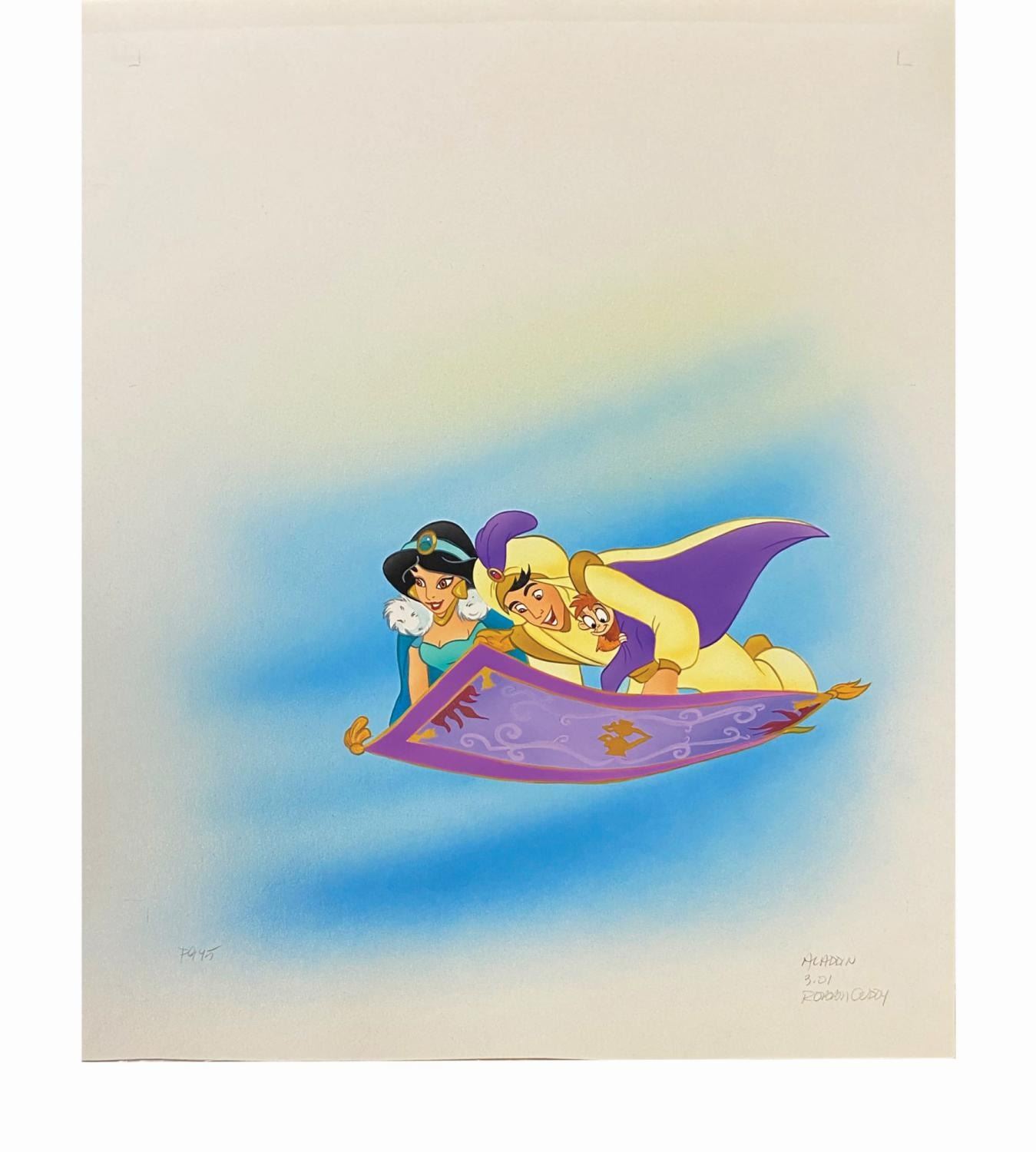 (Disney, 2001) An original published illustration for the Disney Press storybook Disney's 5-Minute Princess Stories by artist Robbin Cuddy. Featuring Aladdin, Princess Jasmine, Abu, and the flying carpe, the illustration is accomplished in airbrush and acrylic on lightweight art board. Measuring 8.5"x10" on a 15"x11" board, the artwork is in fine condition with minimal production wear. A Disney Auctions information form is included.