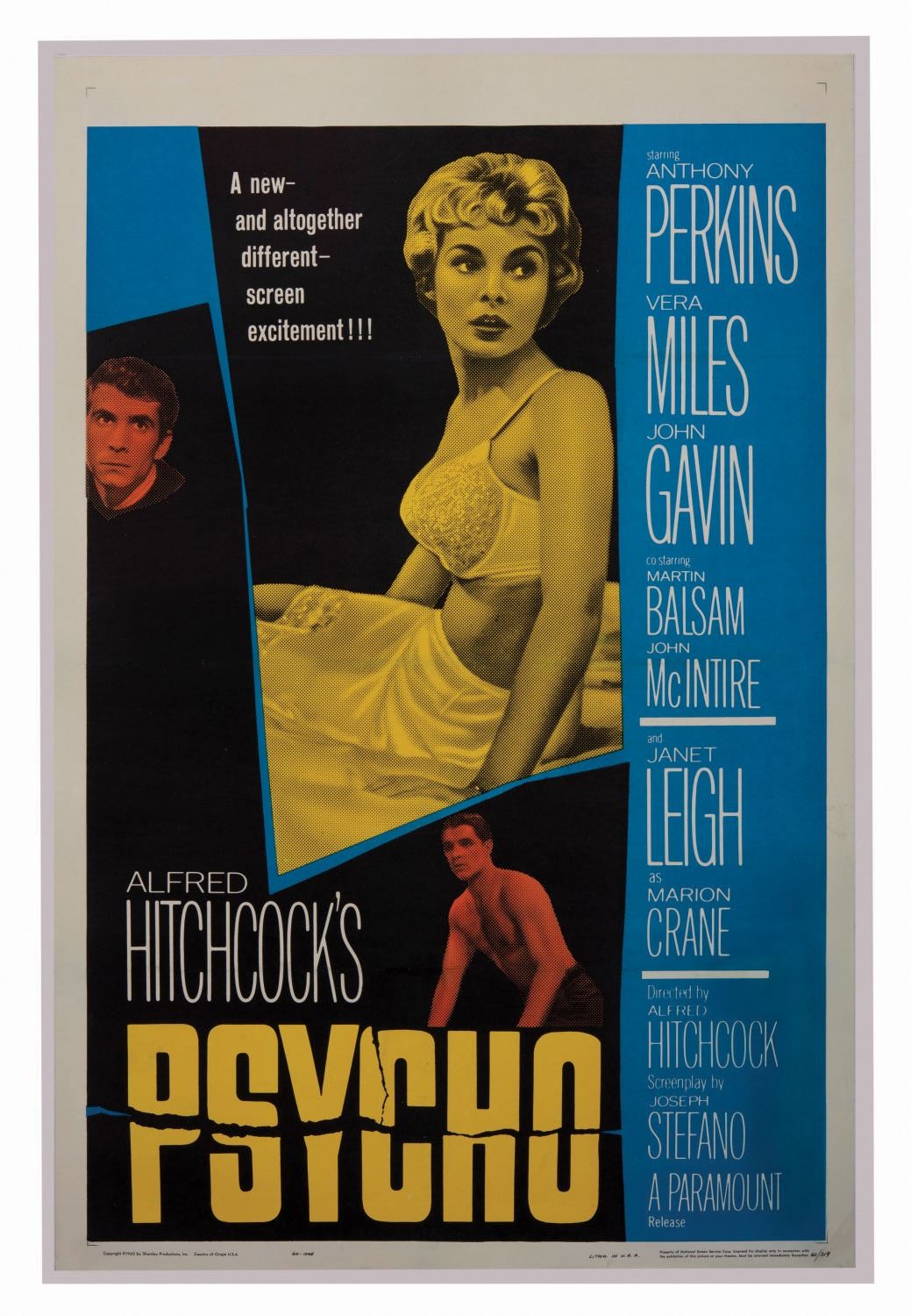 (Paramount, 1960) An original release one sheet poster for Alfred Hitchcock's "Psycho." Measuring 41"x27" the poster was originally folded but has been linen backed for display and is in very good condition.