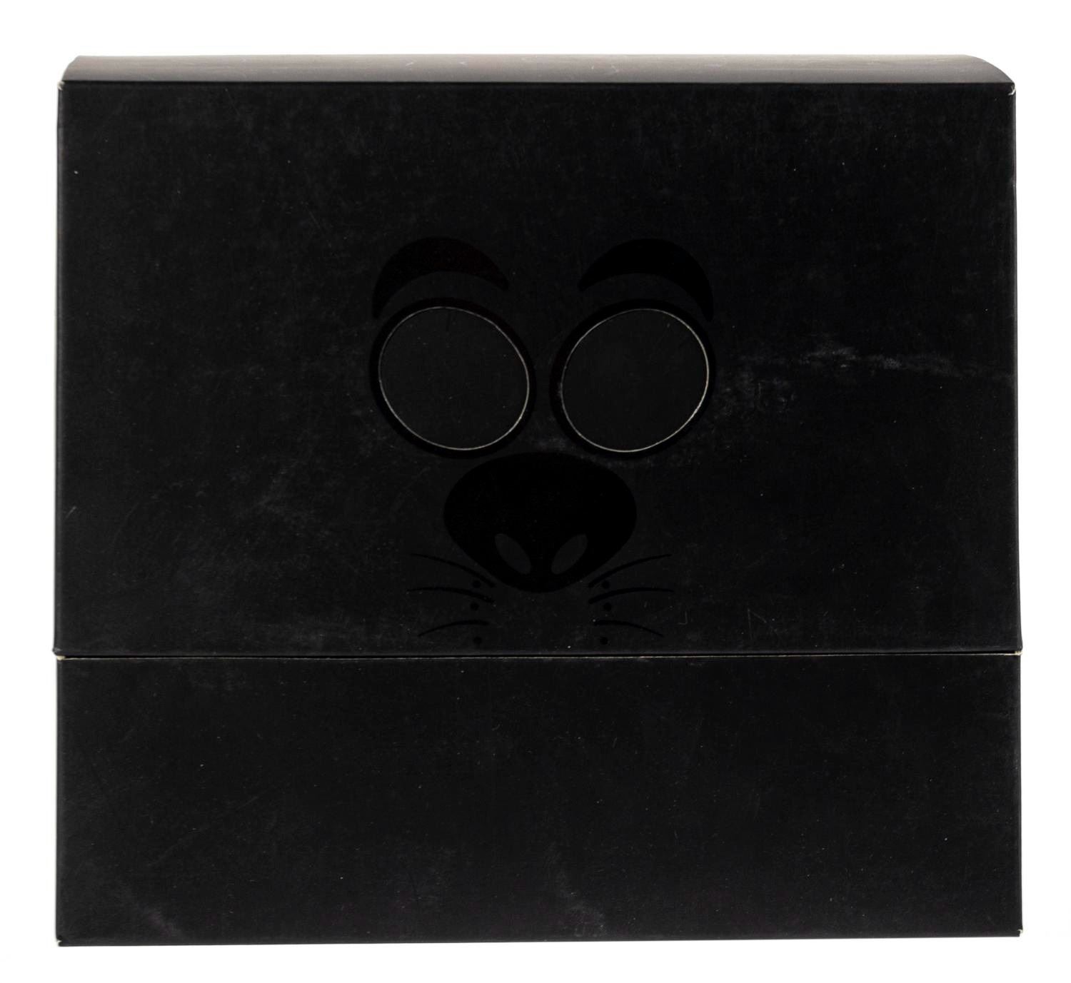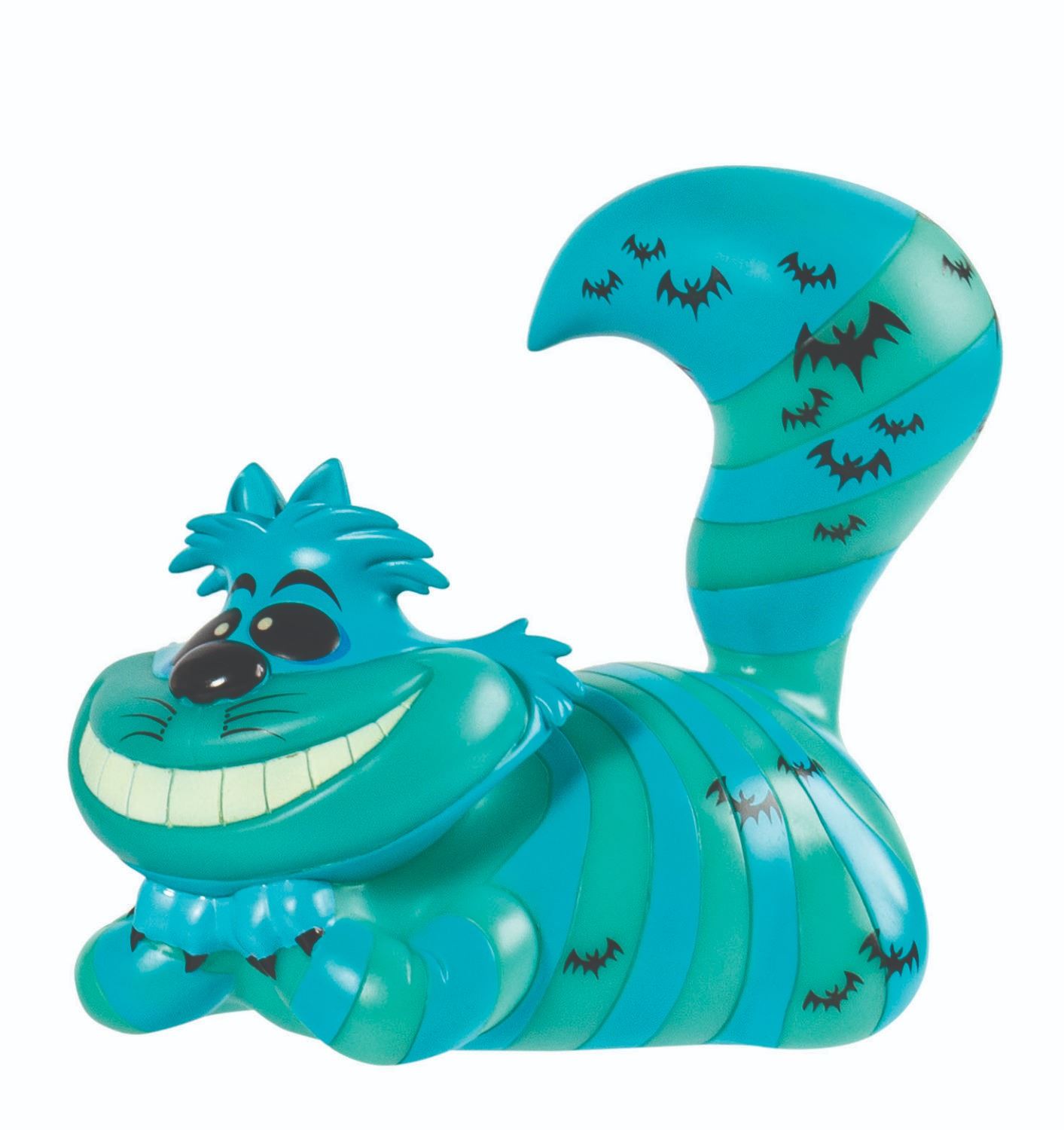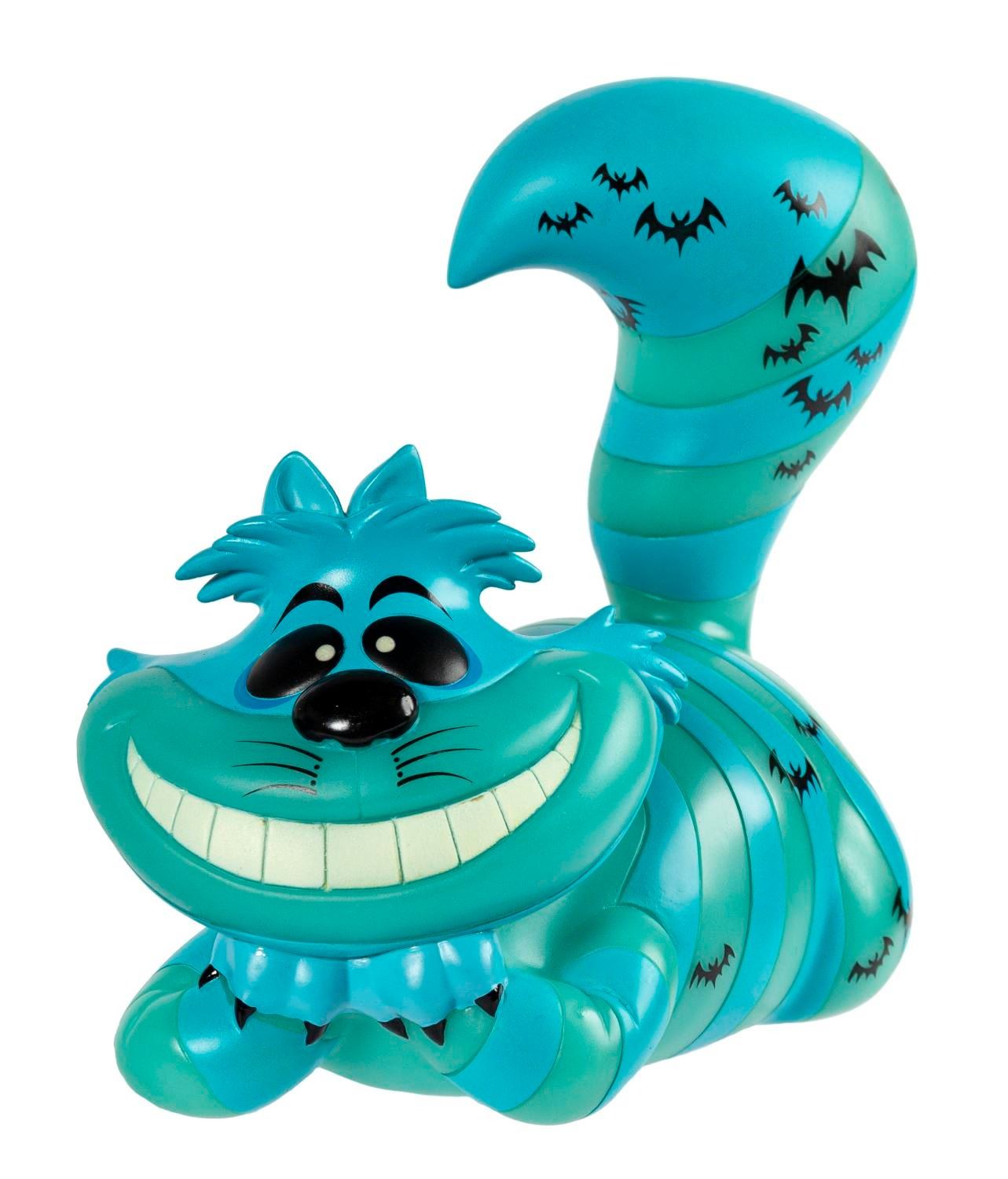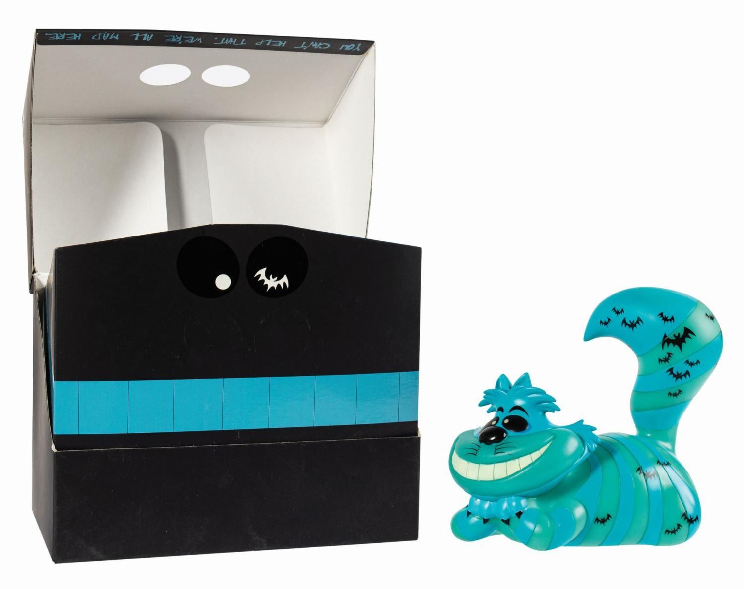 (Disney, 2006) A Haunted Mansion Alice in Wonderland Cheshire Cat vinyl figure sculpted by Monster5 and manufactured by Span of Sunset. Inspired by the famous Disneyland attraction, the figure is a ghostly blue and features spooky bat detailing overall. The original concealed Cheshire Cat face cardboard box packaging designed by Nathan Cabrera is included. The figure measures 7" tall and the box is 9"x10" and 6" deep. The figure is in fine condition with minor surface wear and the box exhibits some minor scuffing and surface impressions.