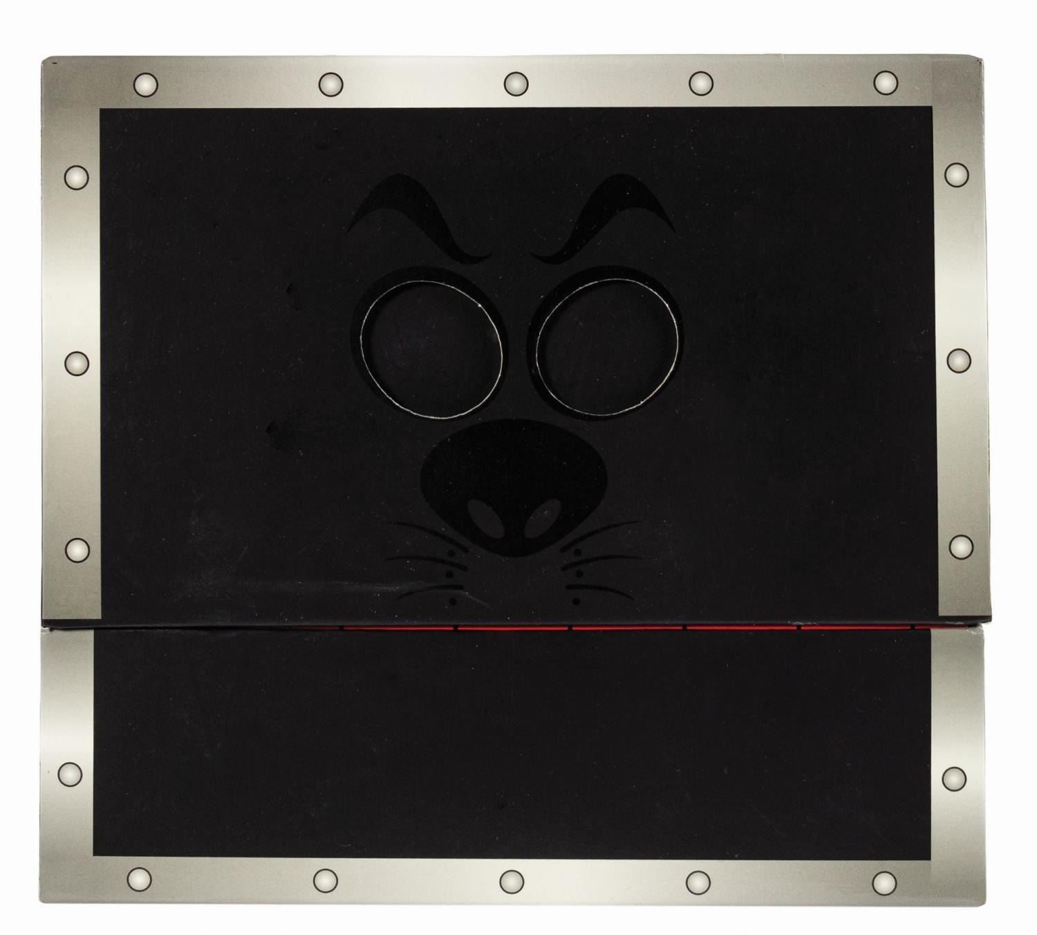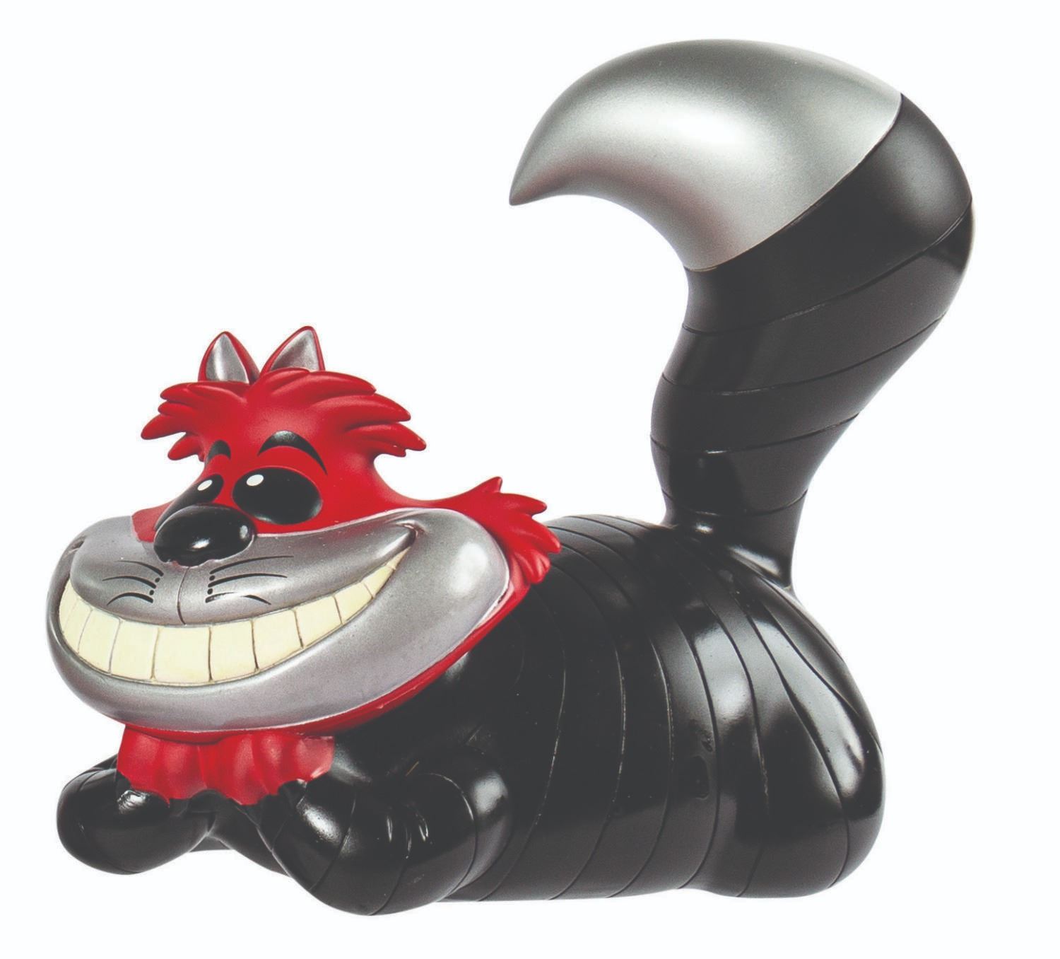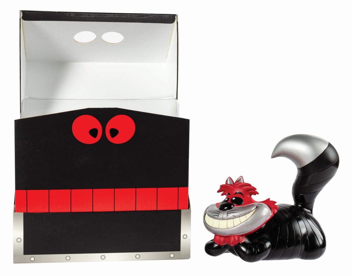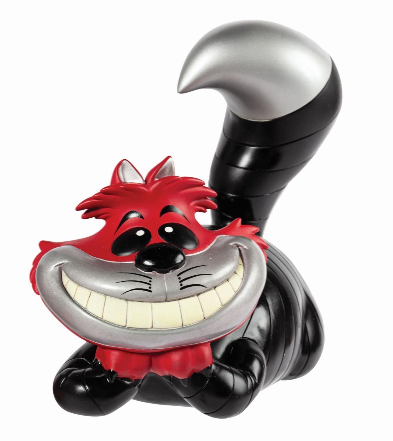 (Disney, 2009) A "Metal" Alice in Wonderland Cheshire Cat vinyl figure sculpted by Monster5 and manufactured by Span of Sunset. The figure pays tribute to the heavy metal musical genre and subculture with its black and red color scheme and metallic silver accents. The original concealed Cheshire Cat face cardboard box packaging designed by Nathan Cabrera to look like a musician's road case is included. The figure measures 7" tall and the box is 9"x10" and 6" deep. The figure is in very fine, as-new condition and the box exhibits surface wear and bunching.