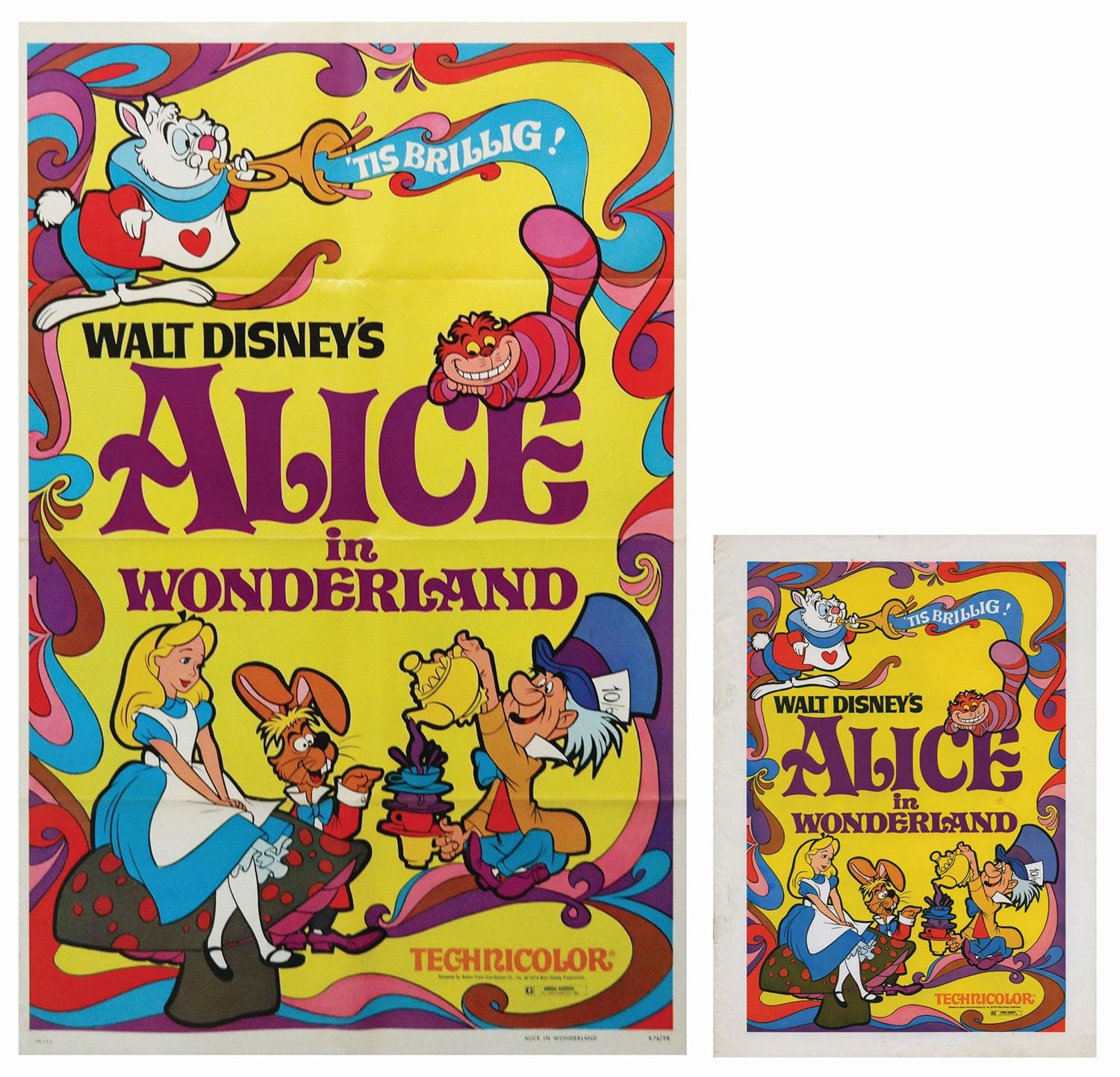 (Disney, 1974) A very rare one sheet poster and 25-page press book promoting the theatrical re-release of Alice in Wonderland. This press book was issued to movie theater owners and newspapers to provide information about the film, and contains prepared articles for publication, newspaper print ads, photos, as well as an Alice in Wonderland maze and crossword puzzle. The poster measures 40"x27" and the matching pressbook measures 15"x11". The poster is in good condition with minor wear, and press book is in good condition with some edge-wear and a removed ad on page 2.