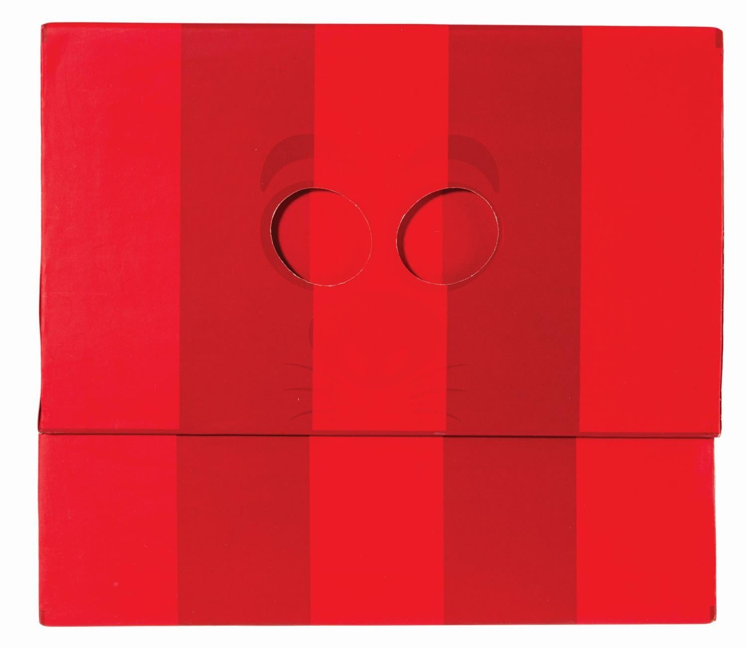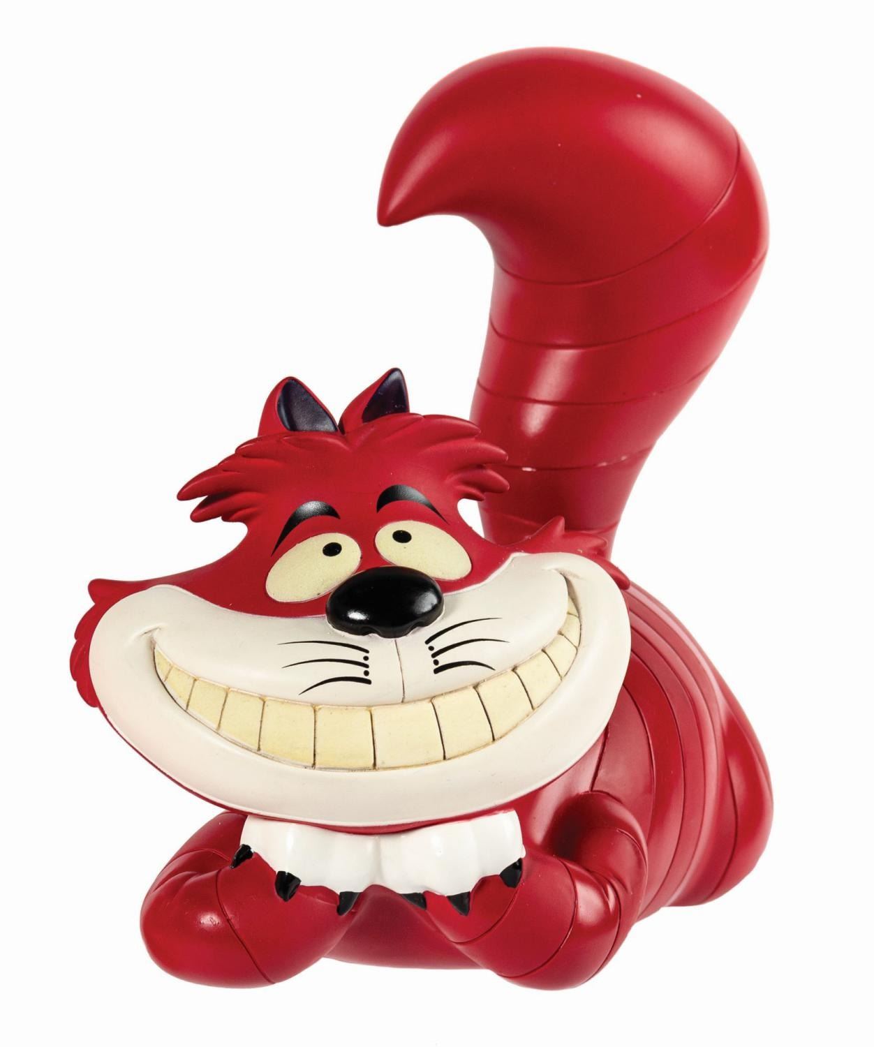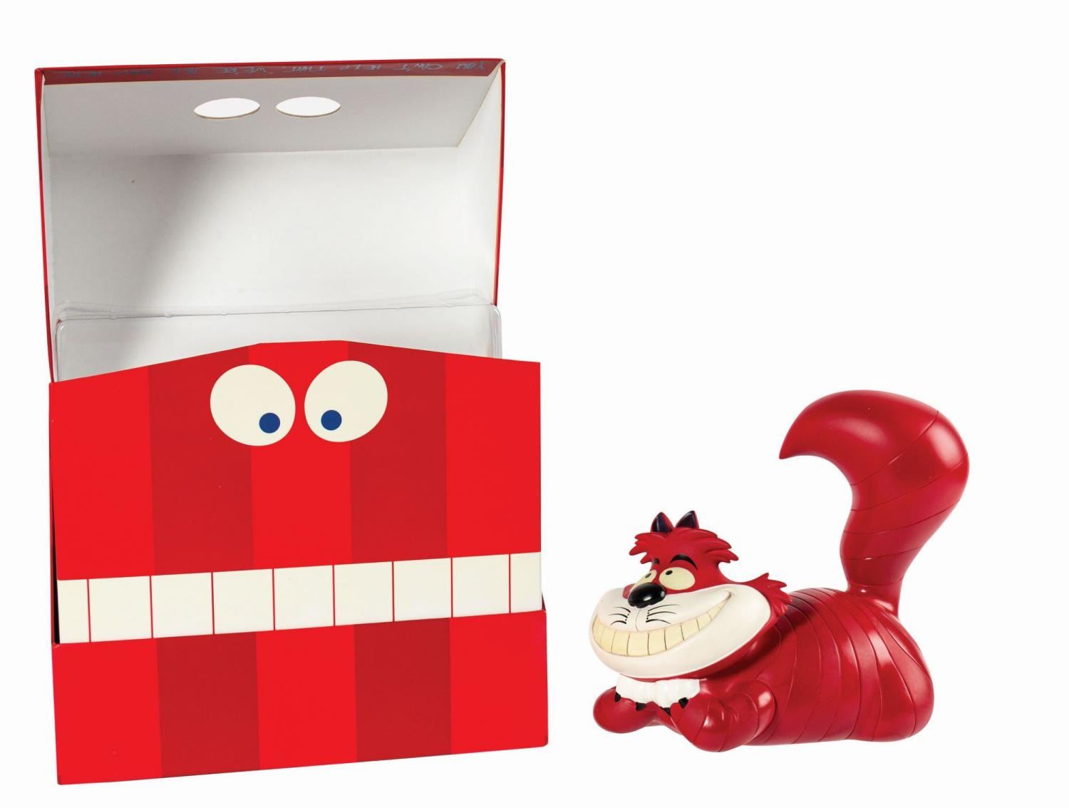(Disney, 2009) A "Red Halo" Alice in Wonderland Cheshire Cat vinyl figure sculpted by Monster5 and manufactured by Span of Sunset. Taking inspiration from the team colors of the Los Angeles Angels, the figure features a red-on-red color scheme with glow-in-dark eyes and teeth. The original concealed Cheshire Cat face cardboard box packaging designed by Nathan Cabrera is included. The figure measures 7" tall and the box is 9"x10" and 6" deep. The figure is in very fine, as-new condition and the box exhibits only minor wear.