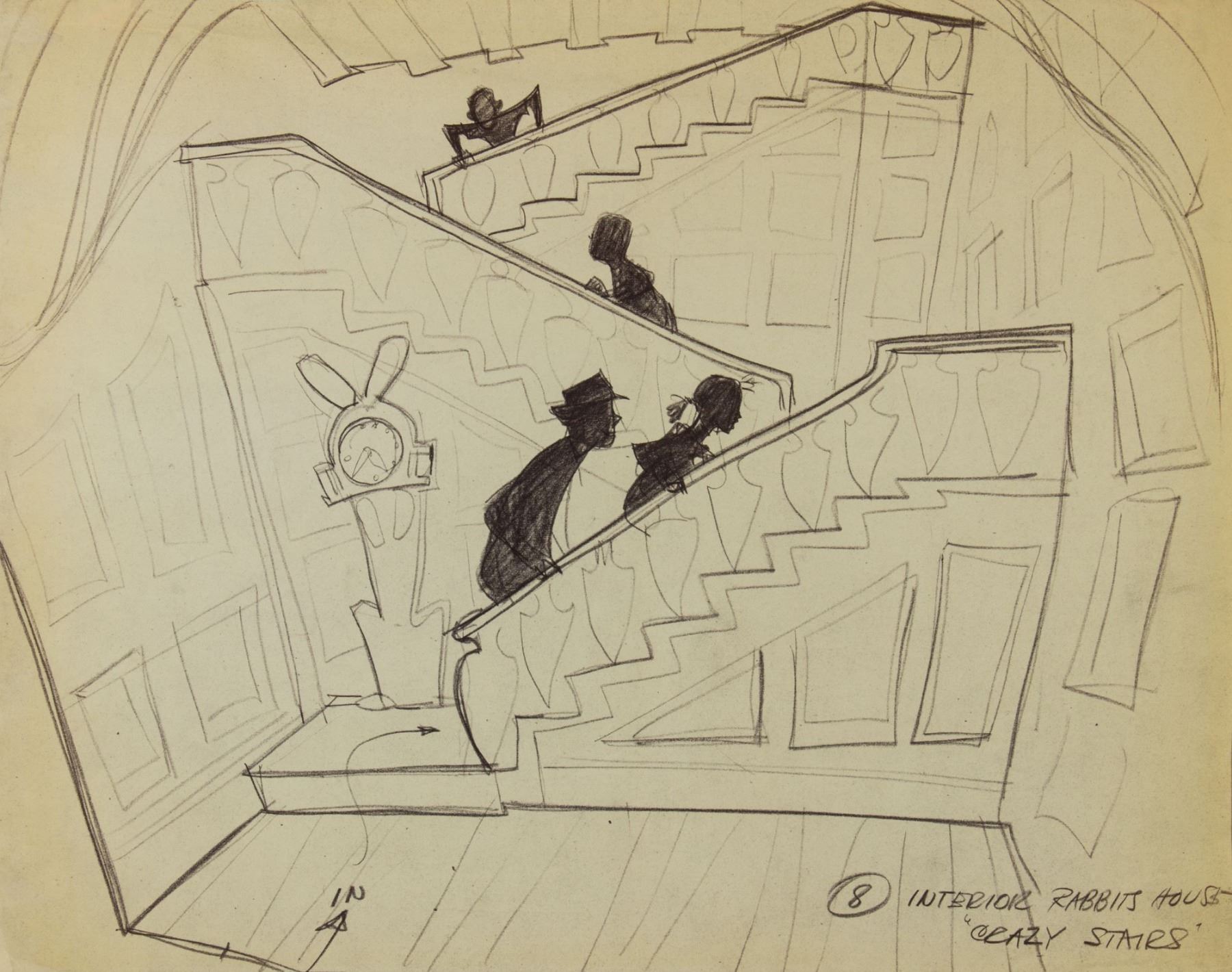 (Disneyland, c.1954) A concept brownline created by Imagineer Bruce Bushman for an "Alice in Wonderland" walk-through attraction. While an "Alice in Wonderland" attraction did open in Fantasyland in 1958, original plans for the park included a walk-through version of the attraction based on several key scenes from the film. Due in part to time and budgetary issues prior to the opening of the park, the walk-through version was delayed and eventually evolved into the ride-through version many are familiar with today. This brownline features the interior of the White Rabbit's house, and is titled "Crazy Stairs". The brownline measures 18.5"x24" and is in very good condition with a few thin strips of tape adhered to the back of the sheet.