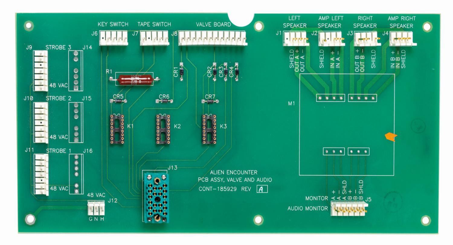 (Walt Disney World, 1995-2003) A park-used circuit board from the control console for the ExtraTERRORestrial Alien Encounter at the Magic Kingdom. The theater-in-the-round sci-fi attraction made innovative use of binaural sound for a uniquely immersive experience. This board, etched "Alien Encounter PCB Assy, Valve and Audio Cont-185929 Rev A," was used to control the highly separated speakers that created the positional and atmospheric audio effects which made the Encounter such an intense and thrilling proposition. Measuring 6"x12" and 0.5" deep, the board is in very fine condition.