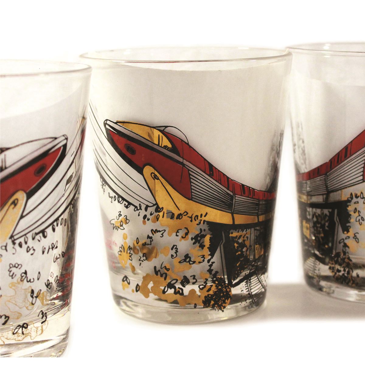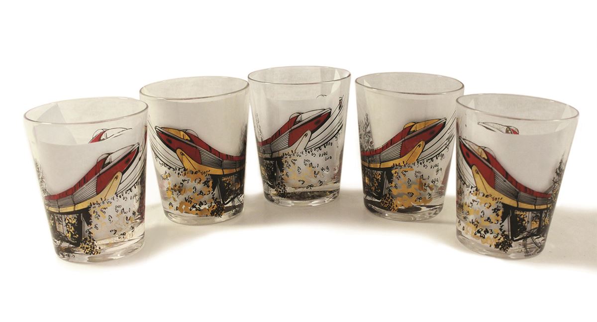 (Disneyland, 1959) An extremely rare set of (5) drinking glasses given away as promotional gifts to contractors and corporate sponsors of the 1959 Disneyland expansion project. The image of the Monorail was pulled from the