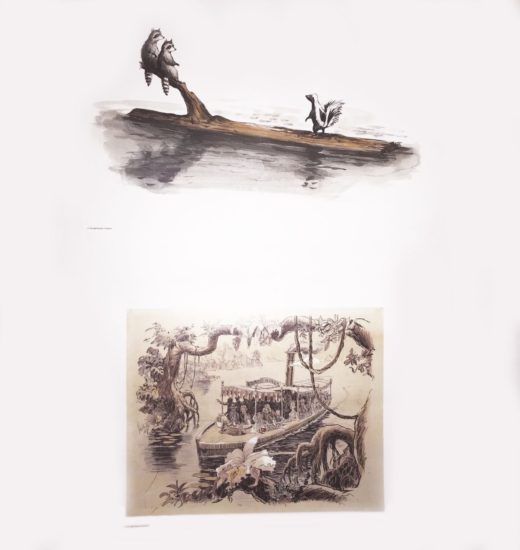 (Disneyland, c.1990s) A large printing test featuring concept artwork from Imagineer's Marc Davis and Harper Goff for the "America Sings" and "Jungle Cruise" attractions. This printing test is believed to have been created as part of a Disney Gallery event, and measures 27"x26" and is in fair to good condition with some creasing to the paper.