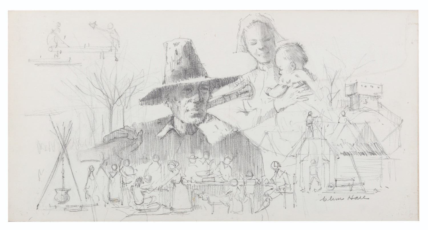 (EPCOT, 1980s) A beautiful early concept drawing for the Freedom Mural at The American Adventure in Walt Disney World. Created by Imagineer Clem Hall, the drawing features a rough depiction of the first Thanksgiving and the early lives of the pilgrims. The graphite art is signed in the lower right corner by Hall, who worked on many major Disney Parks attractions, including Space Mountain and The Haunted Mansion. Measuring 7" x 13.25", the art is in very good condition with light smudges and edge wear.