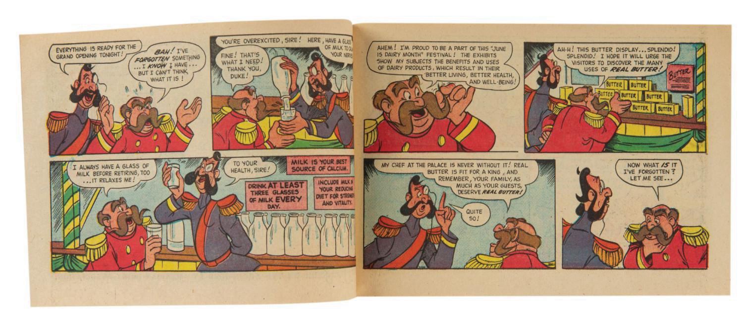 (Disney, 1955) A pair of American Dairy Association promotional Walt Disney comic books created for National Dairy Month in June of 1955. The synergistic promotional Snow White and Cinderella comic books promoted the characters featured on Walt Disney's Disneyland television series on ABC, as well as various American milk processors and dairies which sponsored episodes. Measuring 5"x7.25", each newsprint book is in good condition, with very minor discoloration, creasing, and edge wear from age.